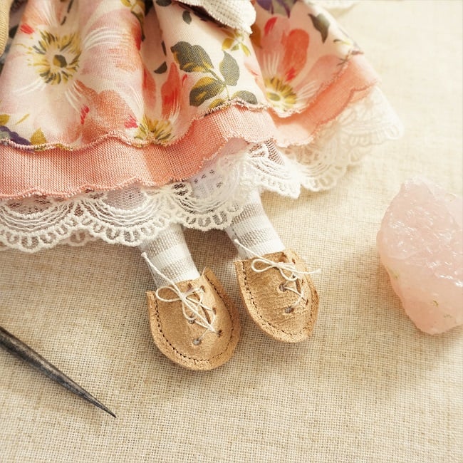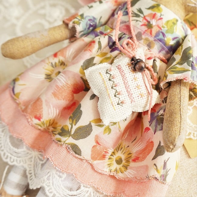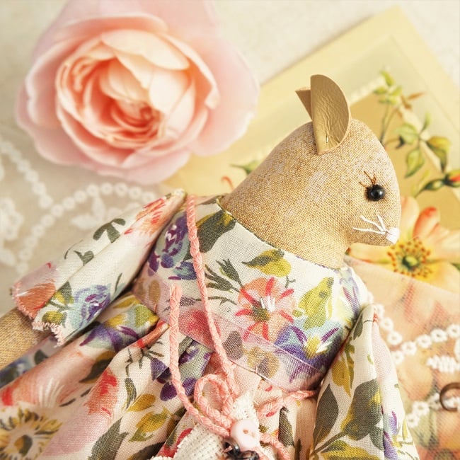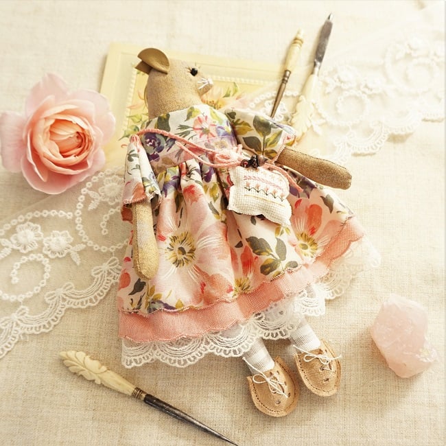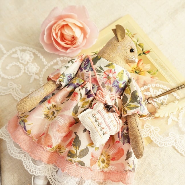 This is Rose, a tiny harvest mouse. She is a hand embroidered mouse with little leather ears and tail. She is dressed in a vintage Liberty tana lawn cotton with coordinating underskirts and cotton lace bloomers. Her dress is finished with organza ribbon, tiny buttons and little leather shoes.