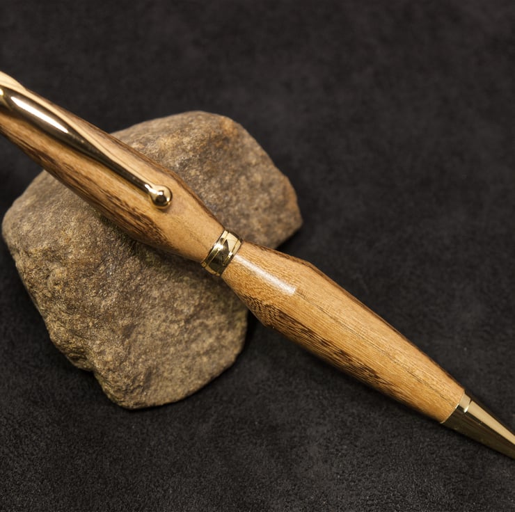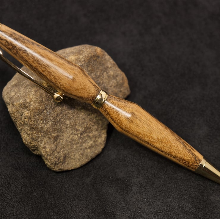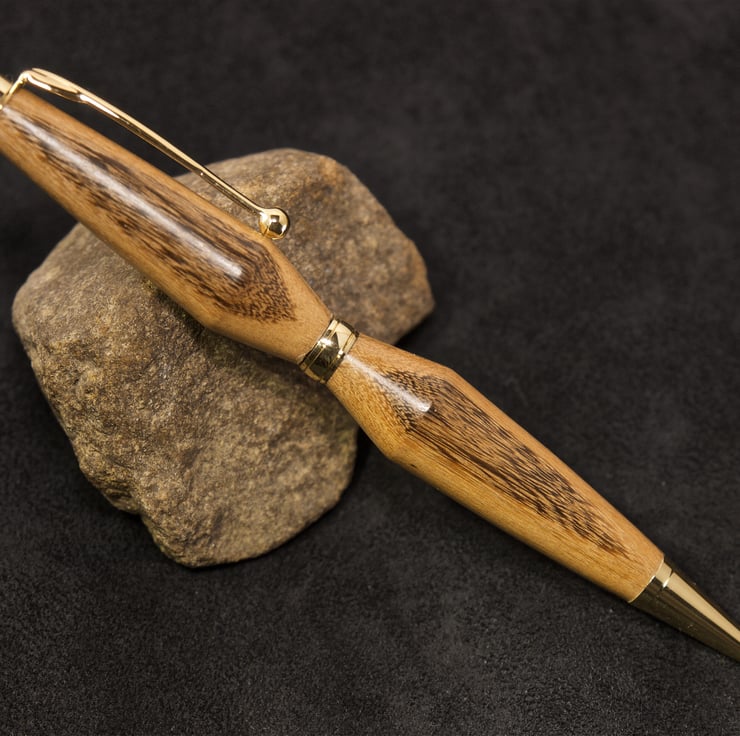 This attractive twist-pen is hand made from a piece of yew wood. The wood came from a 400 year old tree that sadly had to be removed as it had become dangerous after a lighting strike about 10 years ago. Yew is an interesting wood to work with as the colours vary between deep red-brown or black to a light tan, and it polishes to a beautiful finish. The wood I used for this pen has a dark tan and near black grain, and I have turned the two barrels to form a “double-cone”, with the narrow tapers set to the centre, top and tip. The widest part of the “cones” are set towards the centre-band of the pen, giving it an usual and very "art deco" appearance with simple, elegant lines. The twist mechanism is held within the centre of the pen, and the top half is rotated to propel the writing nib which has a black ink refill. The metal tip, centre-band, pocket clip and top finial have a gold finish complimenting the wood beautifully. The pen uses a Cross refill, widely available from any stationers store. To change the refill, you simply pull the two halves of the pen apart and unscrew the refill - there are no springs to loose with this pen. The pen is aproximately 130mm long and 15mm at its widest.