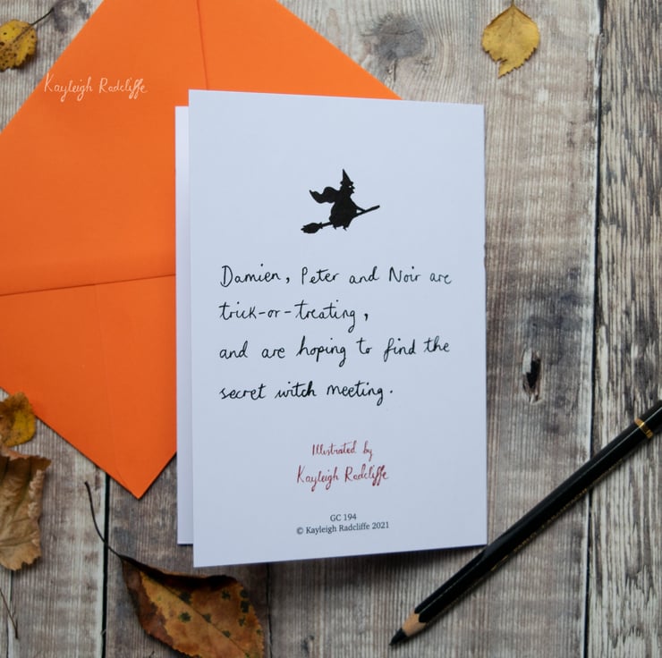 The back of the card reads- "Damien, Peter and Noir are trick-or-treating, and are hoping to find the secret witch meeting."