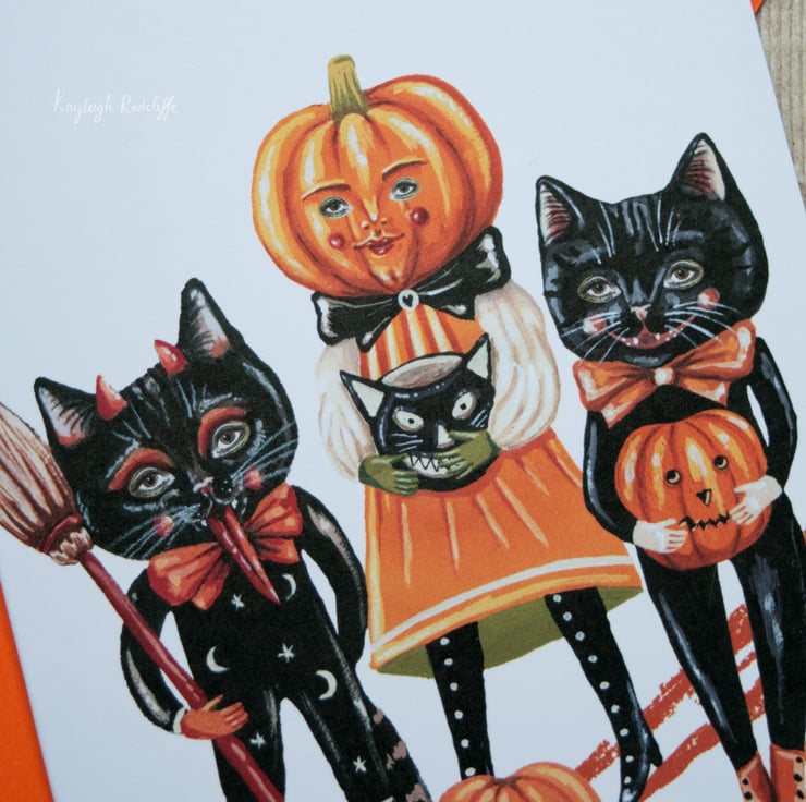 A greeting note card designed and illustrated by me, featuring my characters Noir the black cat, Peter pumpkin and Damien.