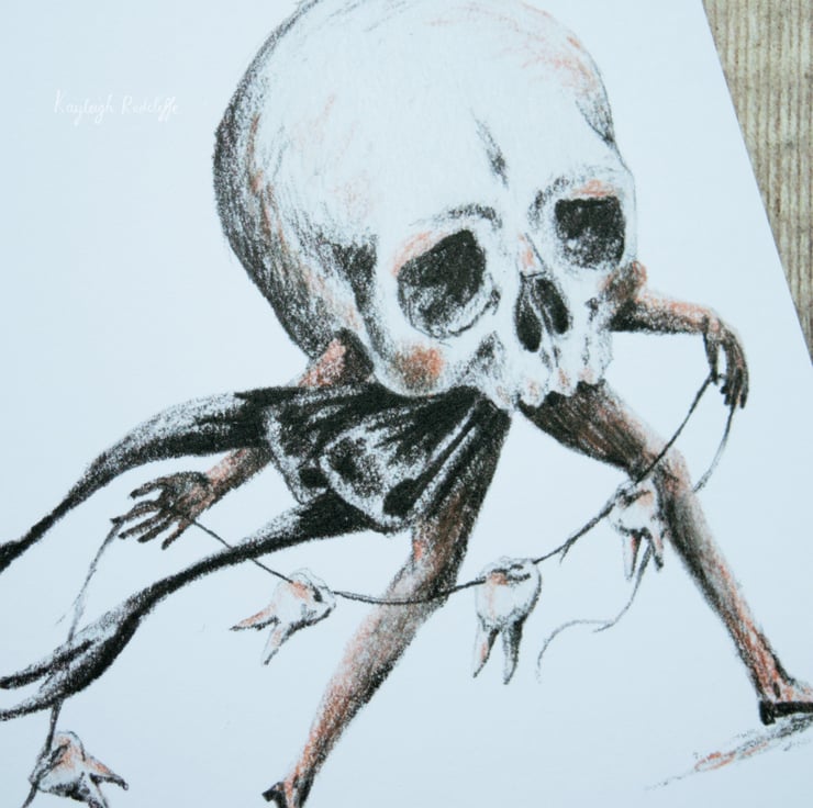 A greeting note card designed and illustrated by me, featuring my popular sketch of a running skull holding a thread of teeth. Weird and wonderful!