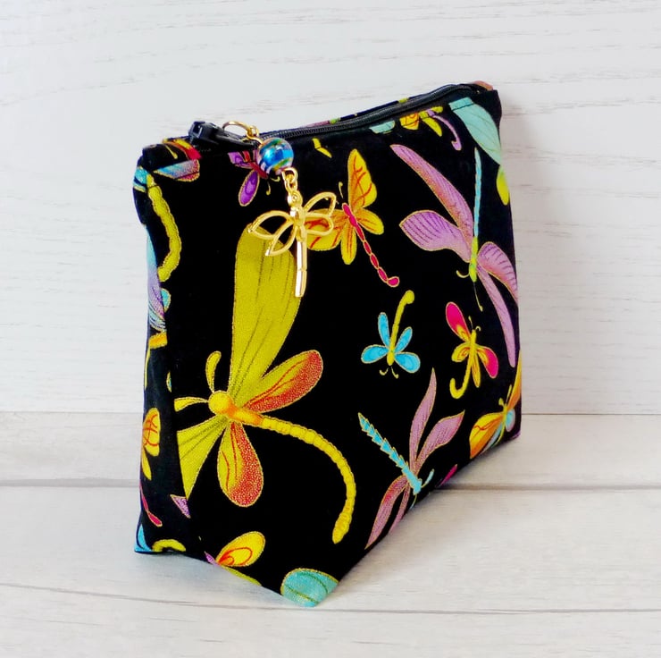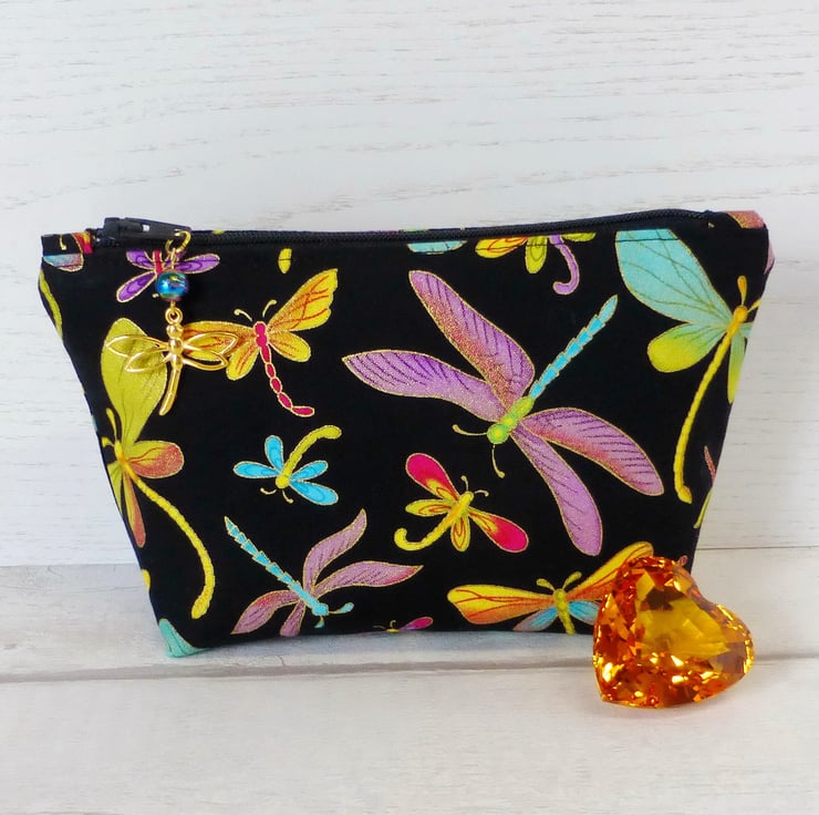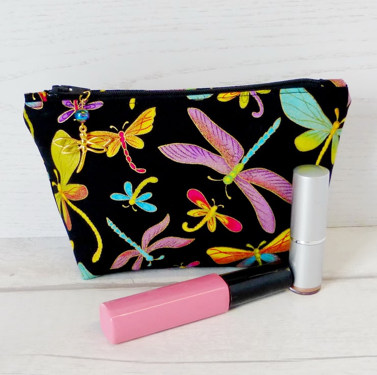 A medium sized make up bag/zipped pouch made from a cotton fabric with a dragonfly design. The dragonfly design fabric is !00% cotton with dragonflies in shades of lilac, turquoise and yellow, all edged with metallic gold and on a black background.
