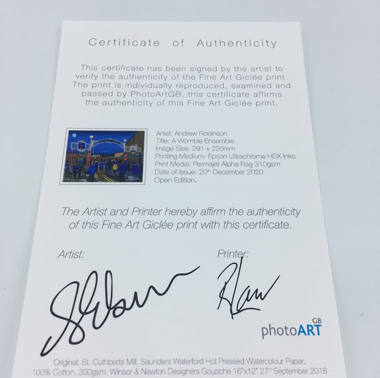 The framed print comes with a 'Certificate of Authenticity' which documents the details of the original painting and the art print. The Certificate of Authenticity is affirmed with a signature from both myself (the artist) and the printer.