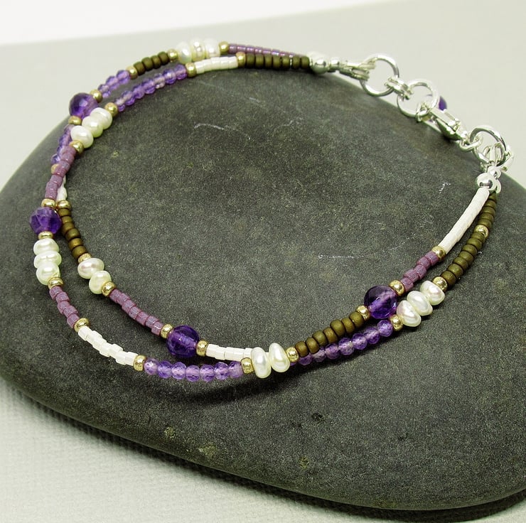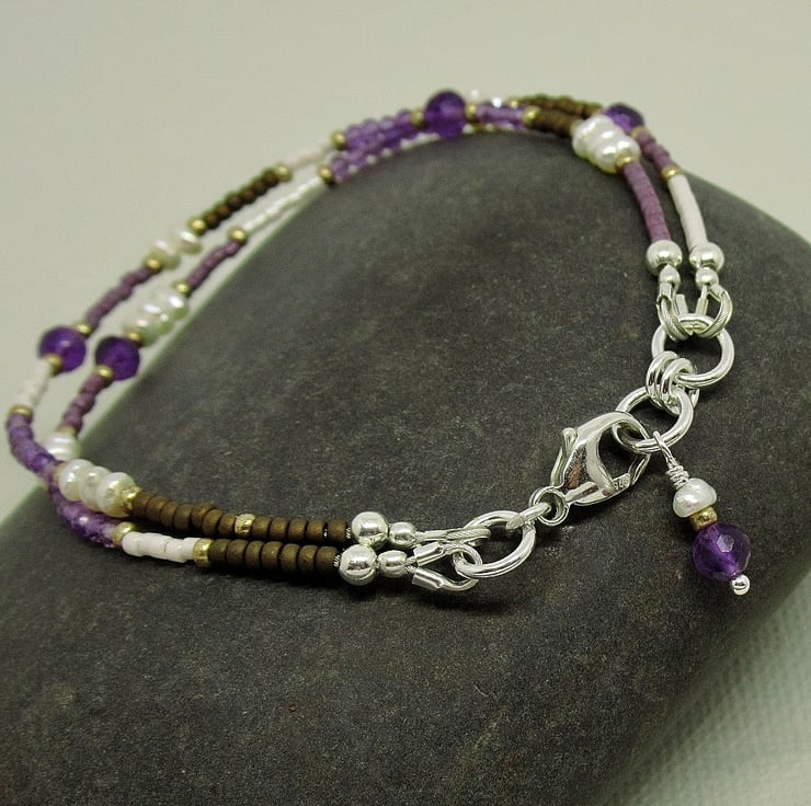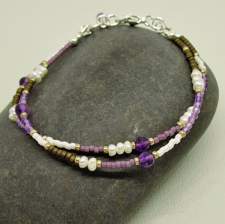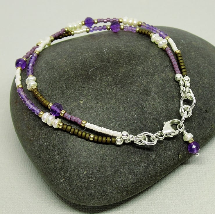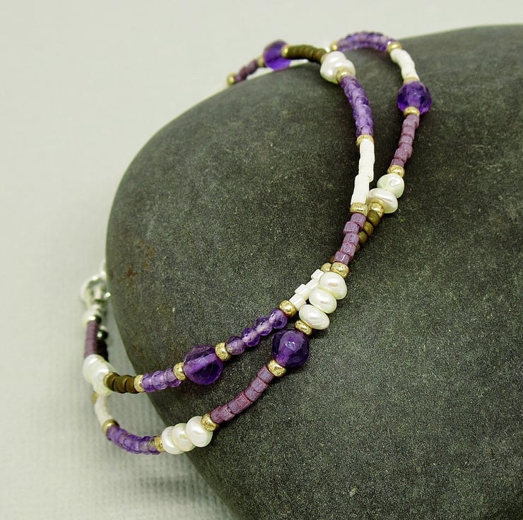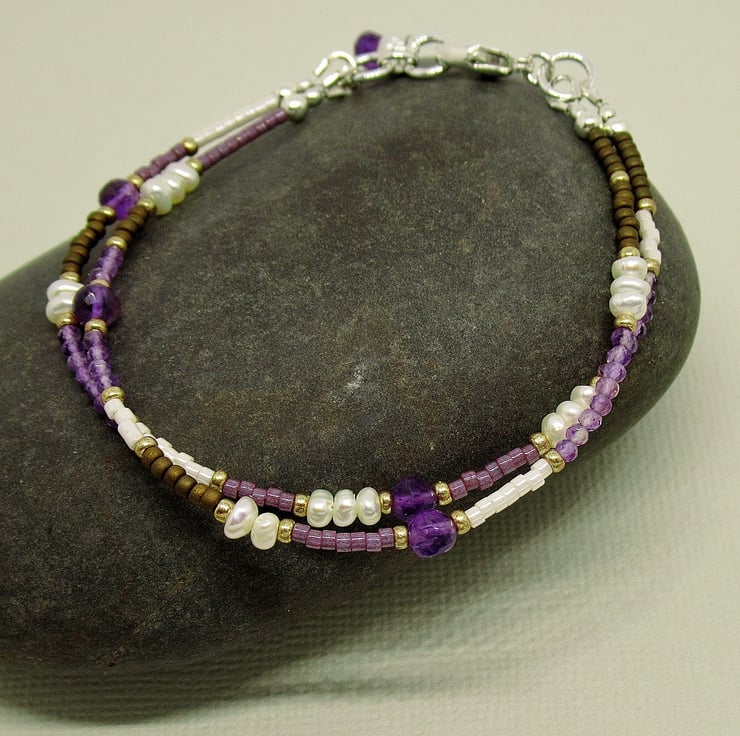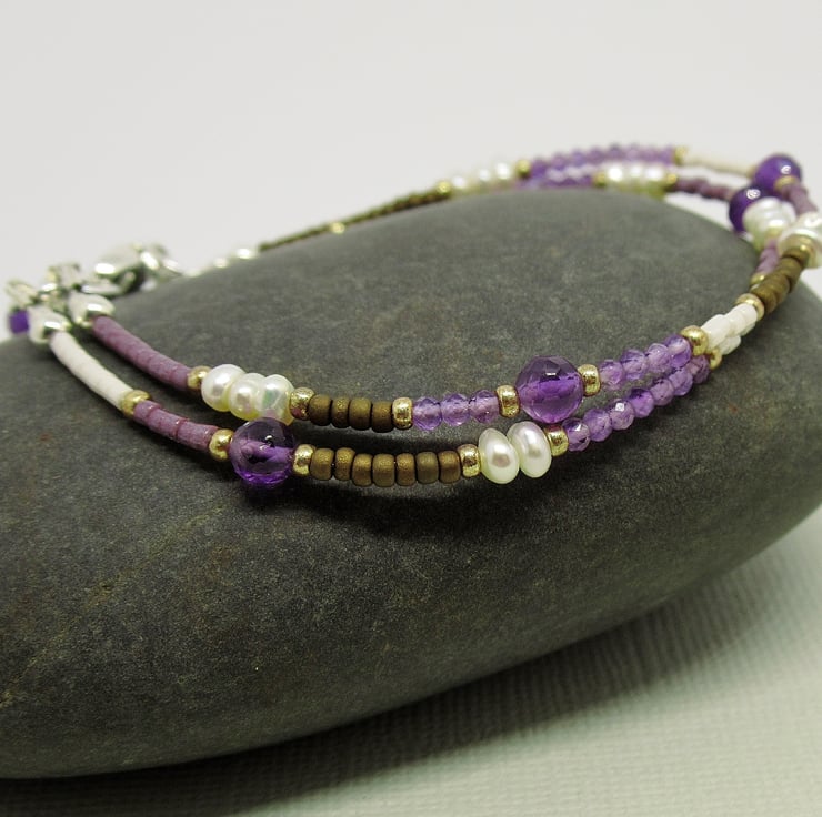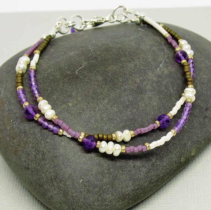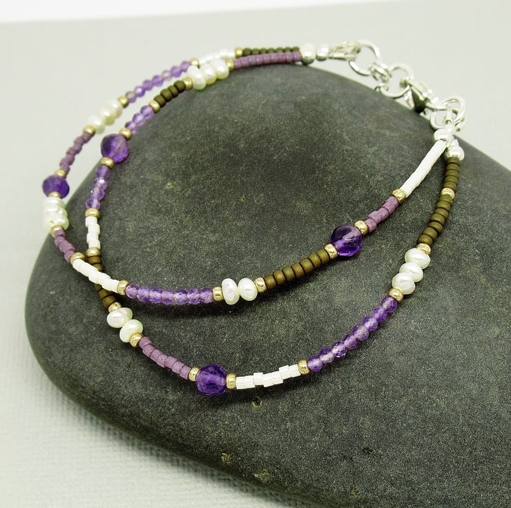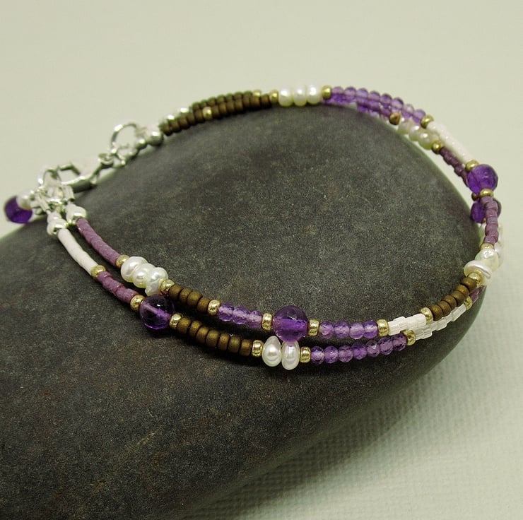 Amethyst and freshwater pearl delicate double strand beaded bracelet featuring tiny purple Amethyst beads and ivory freshwater pearls. These amethyst gemstones are tiny but faceted so really catch the light.