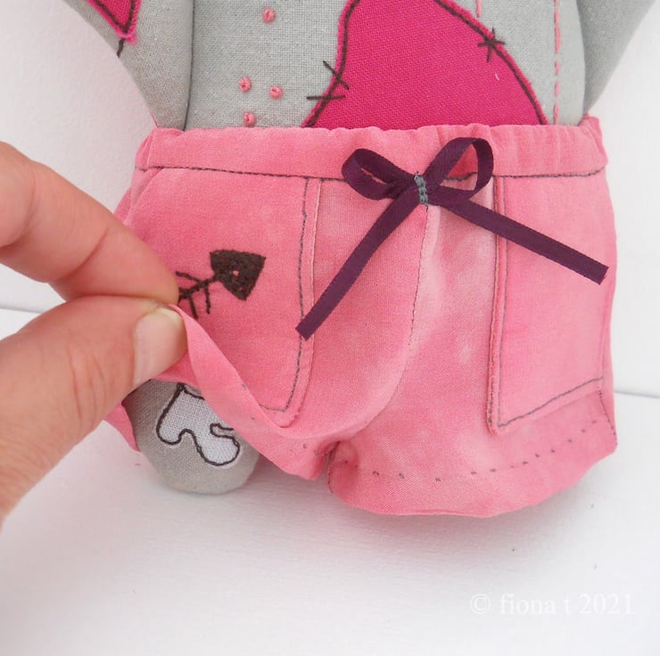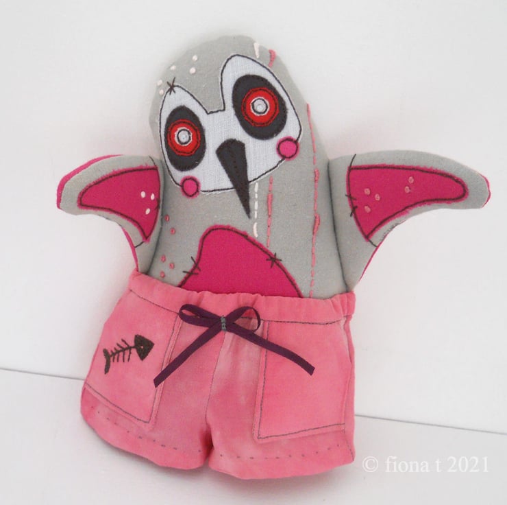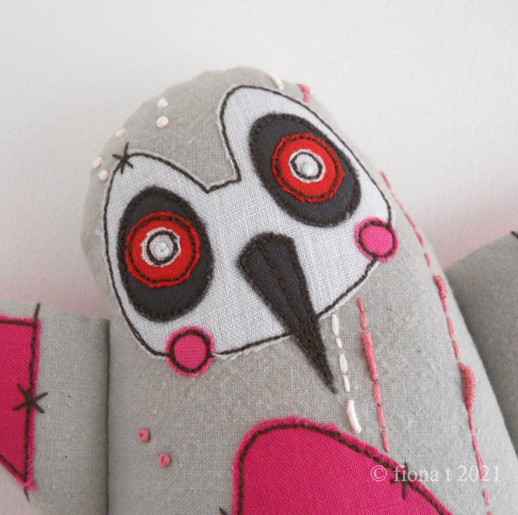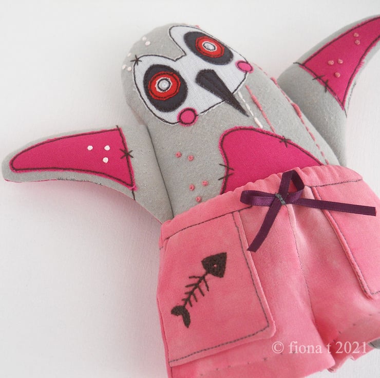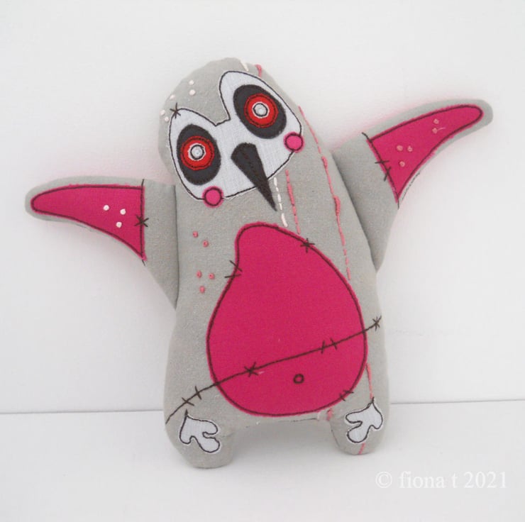 silk pyjama wearin’ zombie penguin - applique, free motion & hand embroidered, size miniature big-ish. PINK!