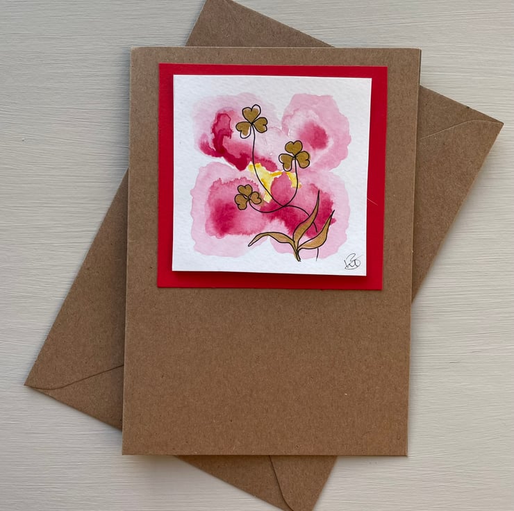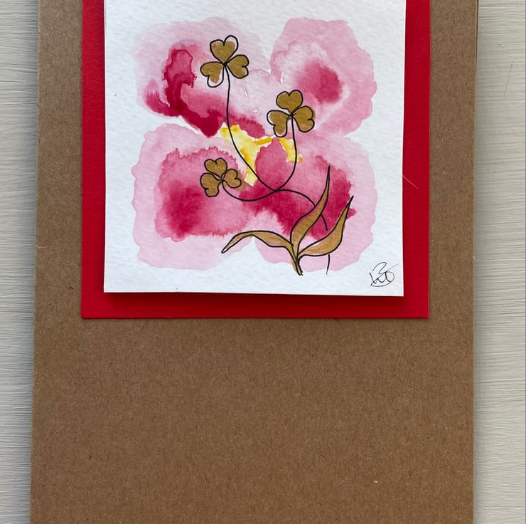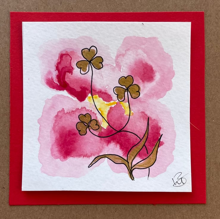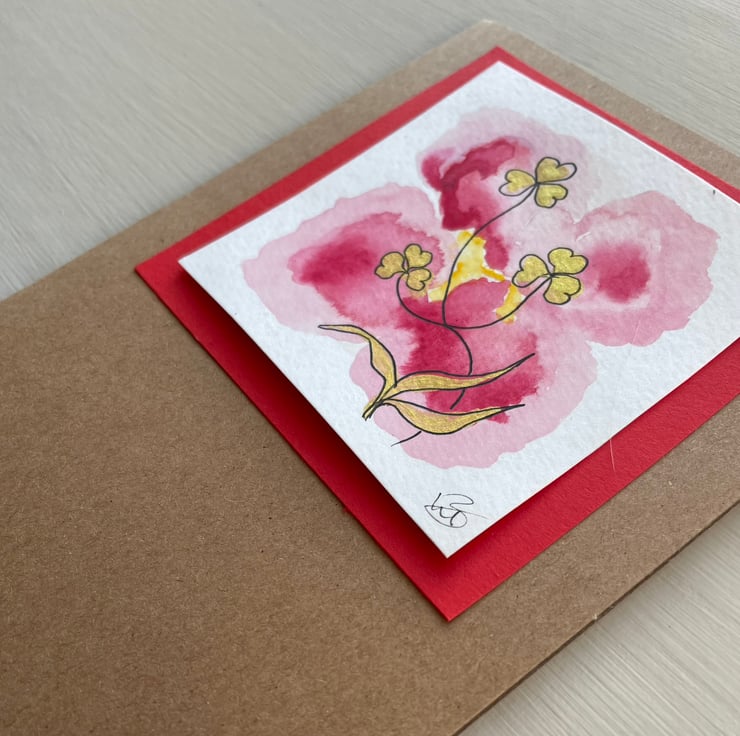 Hand painted watercolour and ink greeting card, the painting is a little abstract piece in pinks with an ink drawing over the top of swirling leaves, painted with gold paint and is mounted onto red card prior to being mounted onto a brown recycled card, left blank for any occasion.