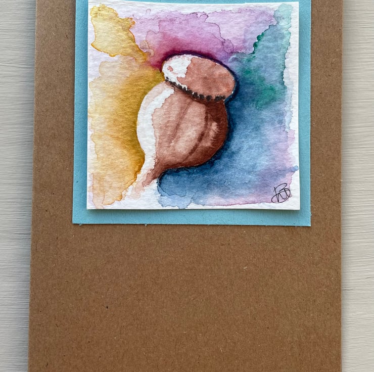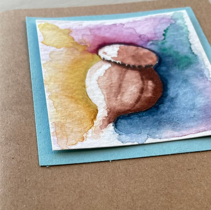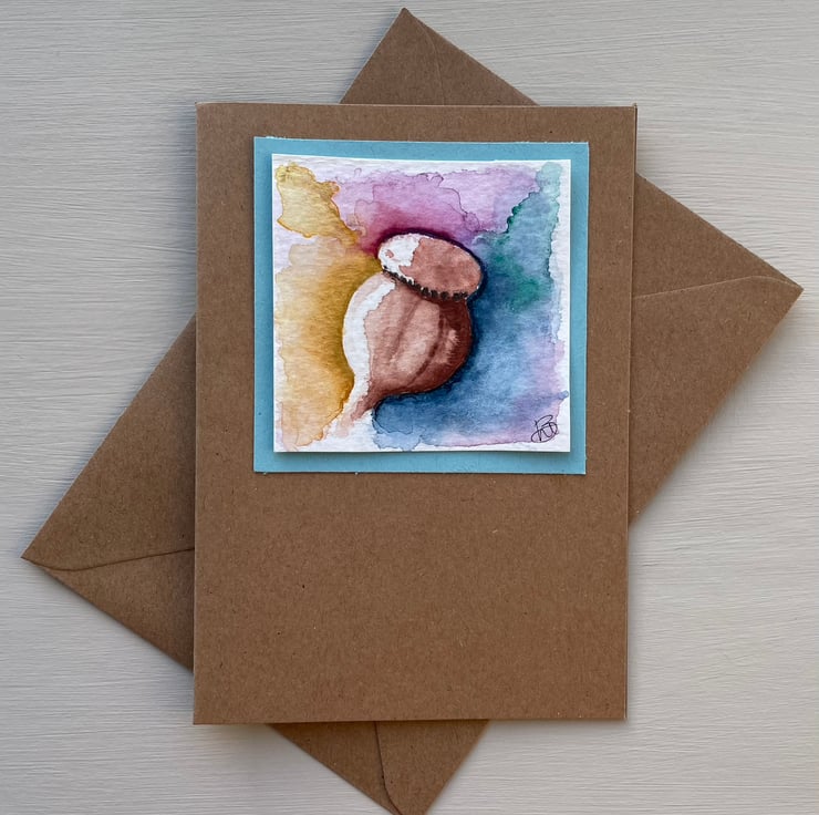 Hand painted watercolour greeting card of a poppy seedhead, mounted on a pale blue card background, prior to mounting onto a blank recycled brown card and left blank for any occasion.