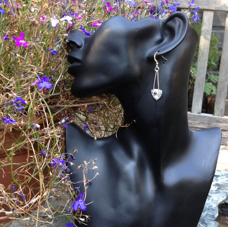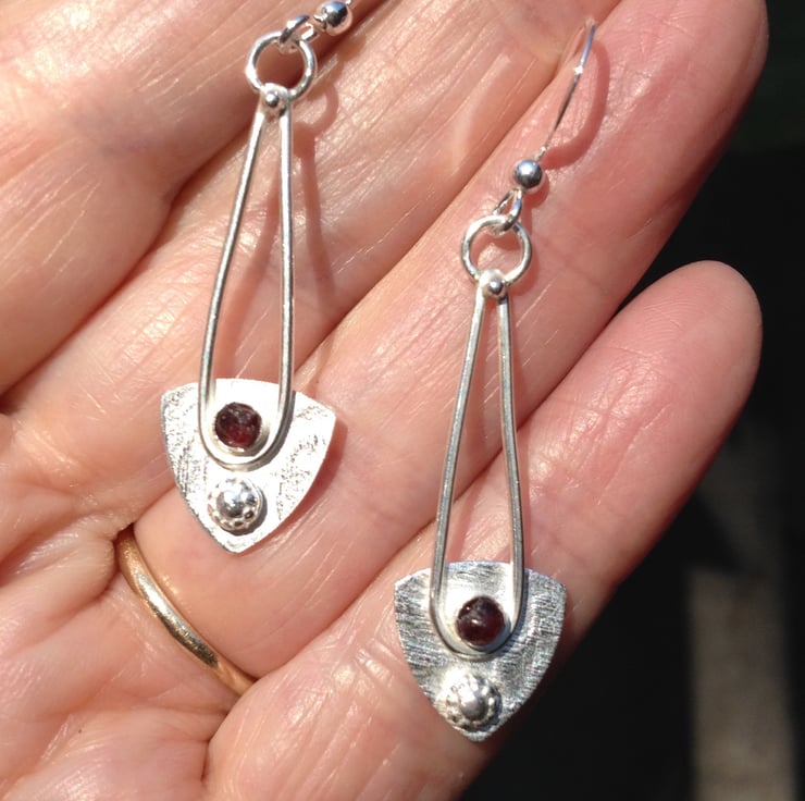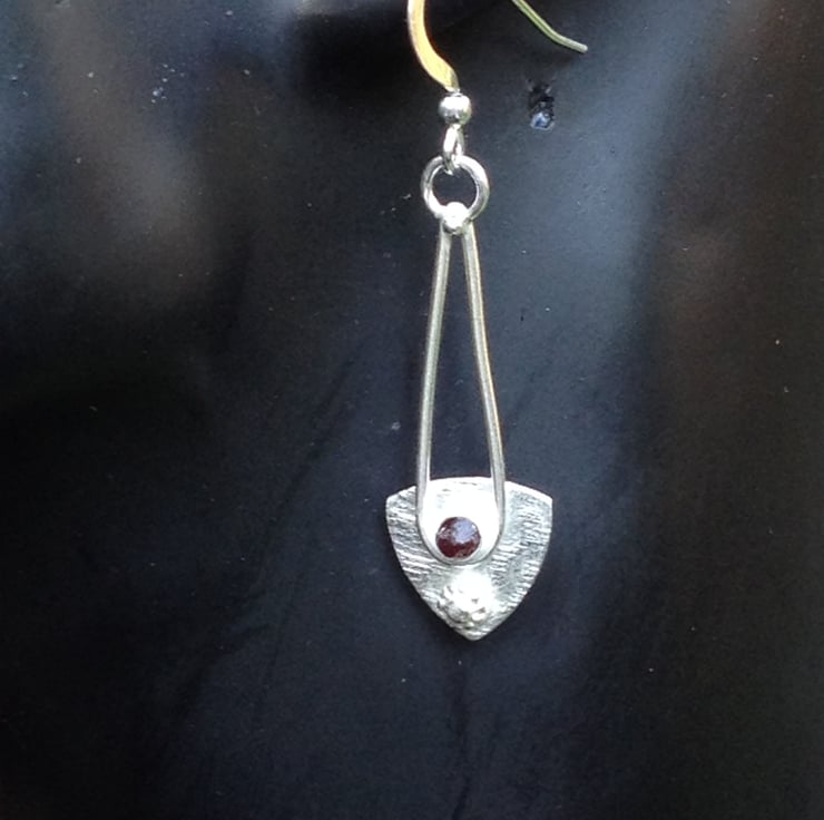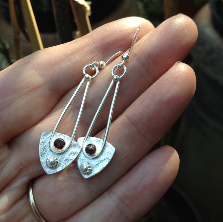 Textured Sterling silver spear shapes with a Thames garnet and a little silver flower made using an antique jewellery die. The earrings measure 12mm wide and hang 50mm from the top of the sterling ear wires. Very attractive silver earrings