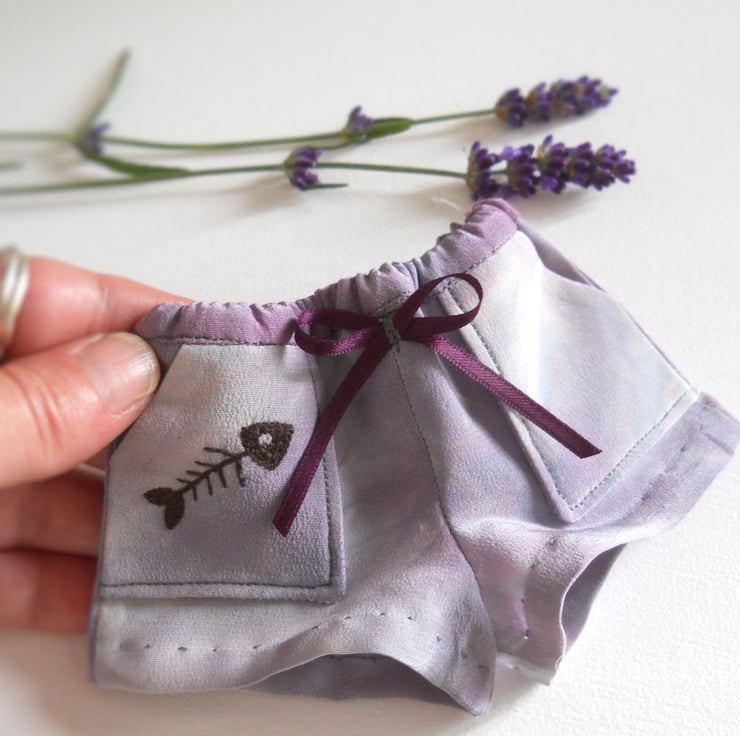 this limited edition sleepy sloth wears bespoke hand tailored purple silk pyjamas. the fish skeleton embroidered pocket is fully lined for carrying important snacks & tissues. obviously.