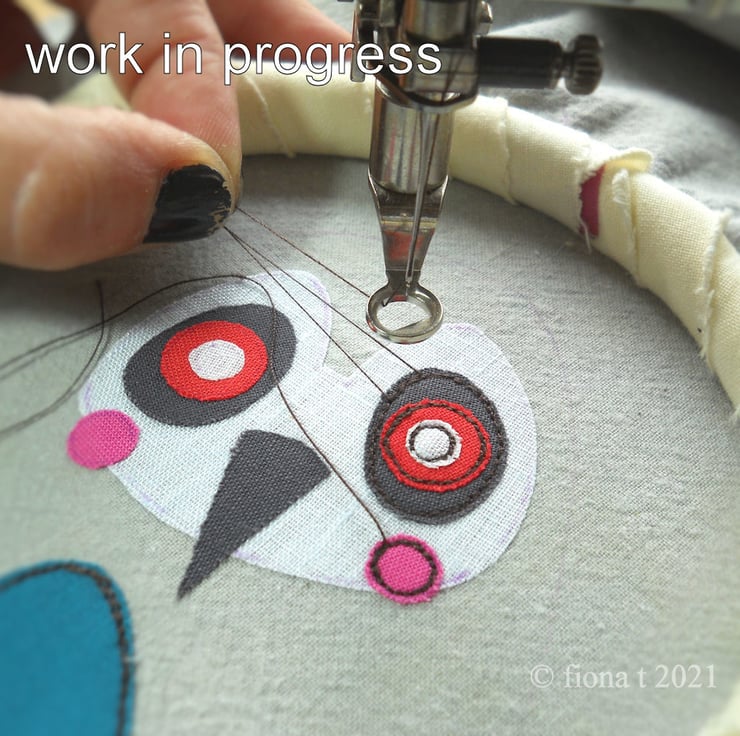 cotton fabrics are appliqued, and the details drawn on with free machine embroidery.