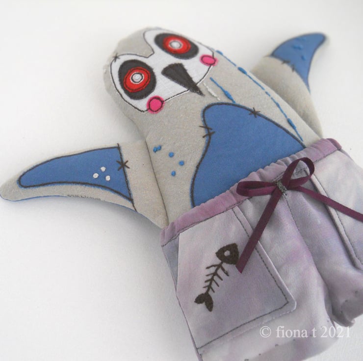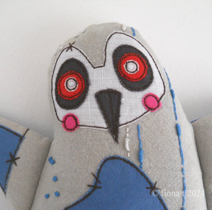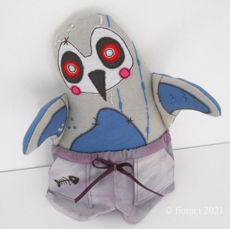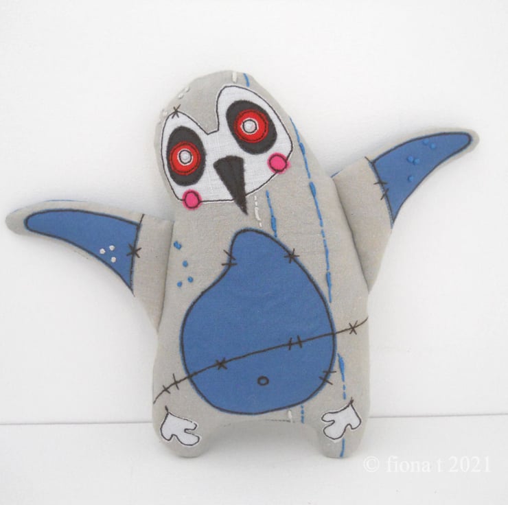 silk pyjama wearin’ zombie penguin - applique, free motion & hand embroidered, size miniature big-ish. BLUE!