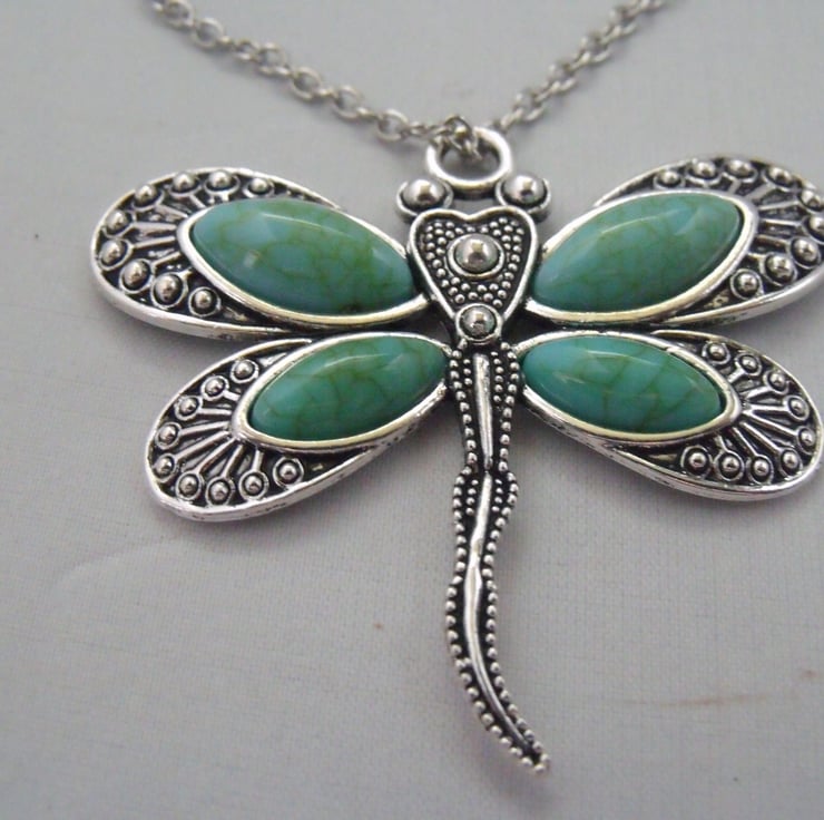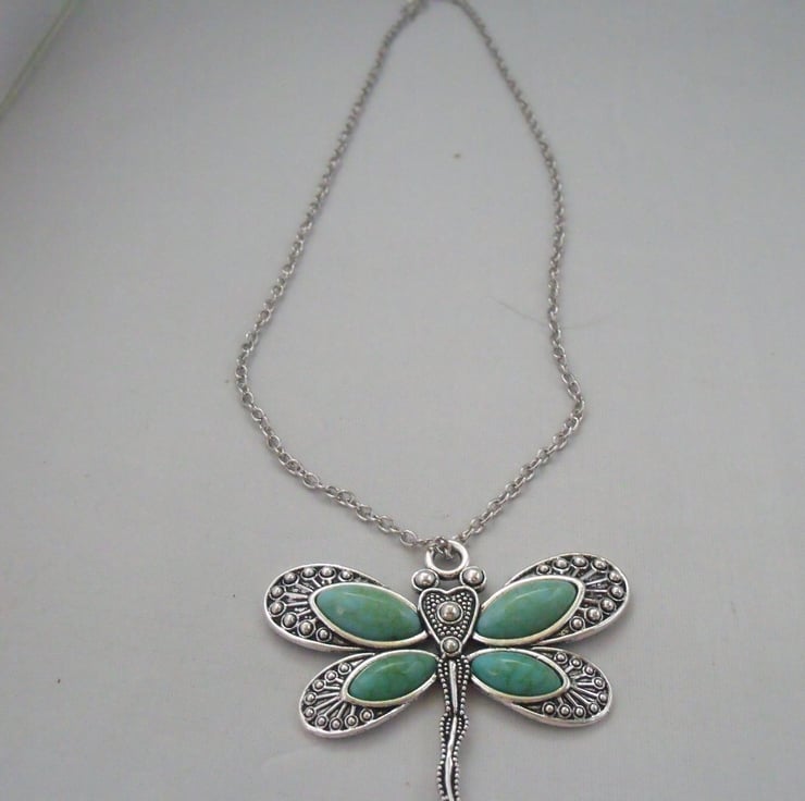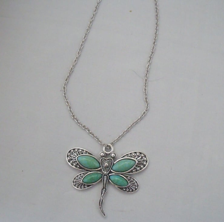This is a lovely turquoise and silver dragonfly pendant, just over 2 inches wide by the same length. It is on a silver chain 19 inches long.