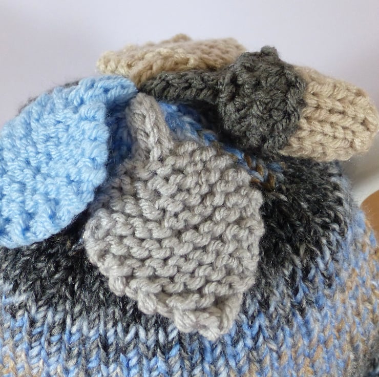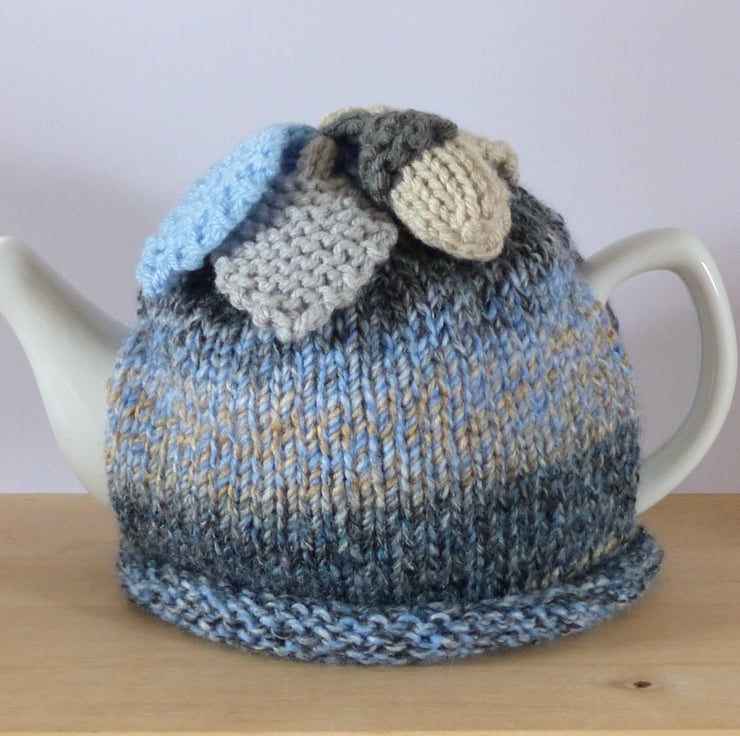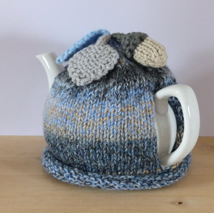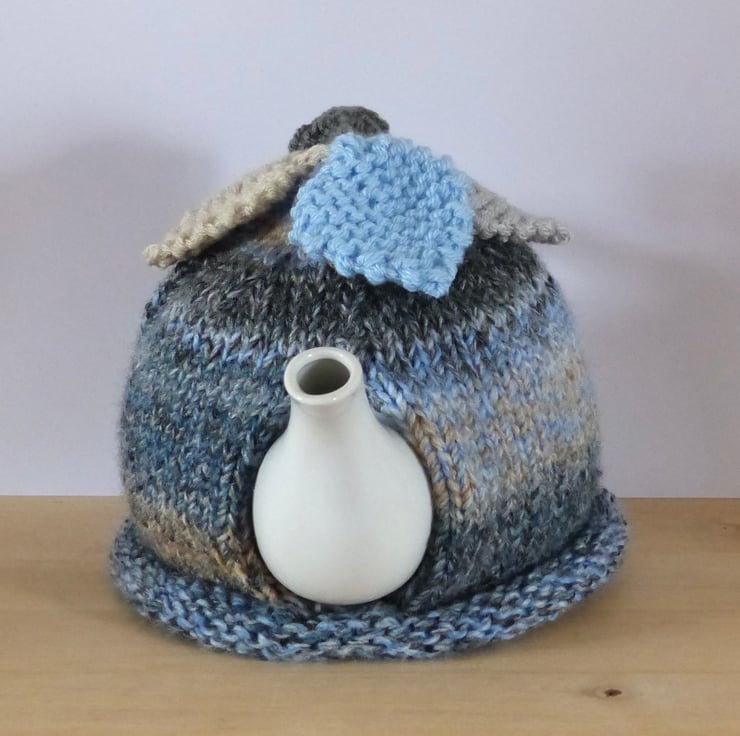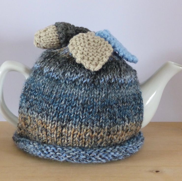 A hand knitted tea cosy in a chunky self patterning yarn in Blues, Greys and Beige. It is decorated with three co-ordinating knitted leaves in Light Grey, Sky Blue and Beige and a matching knitted acorn in Charcoal Grey and Beige. This cosy has been made to fit a standard 4 - 6 cup pot (as illustrated) but has plenty of stretch and a roll rim so should fit a variety of pots. An ideal Housewarming or New Home gift or for a Tea Lover.