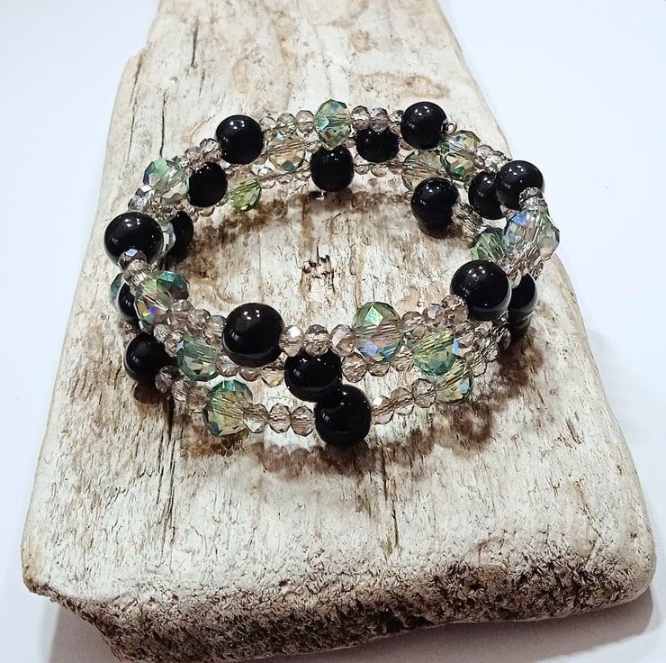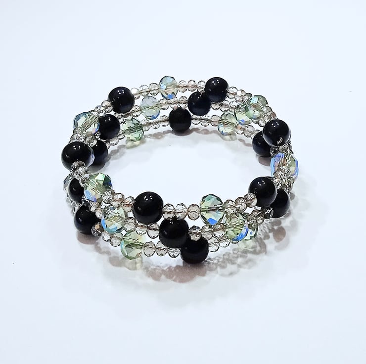 This lovely bracelet is made from memory wire strung with a variety of black and clear crystal beads interspersed with attractive slightly smoked clear beads with an aurora borealis coating to reflect rainbow iridescent colours . The bracelet coils round your wrist, retains it's shape and really catch the light.