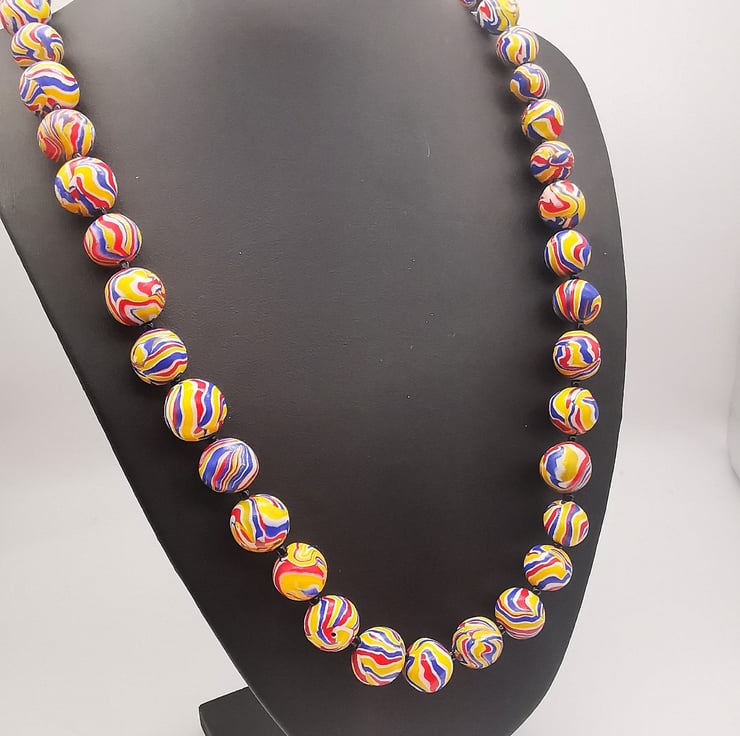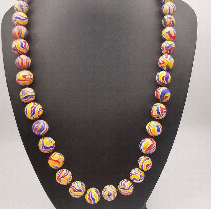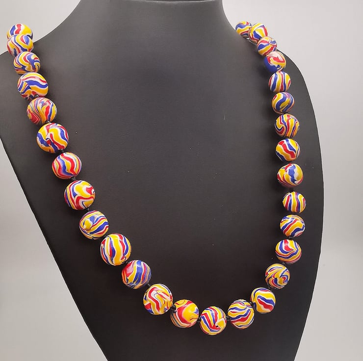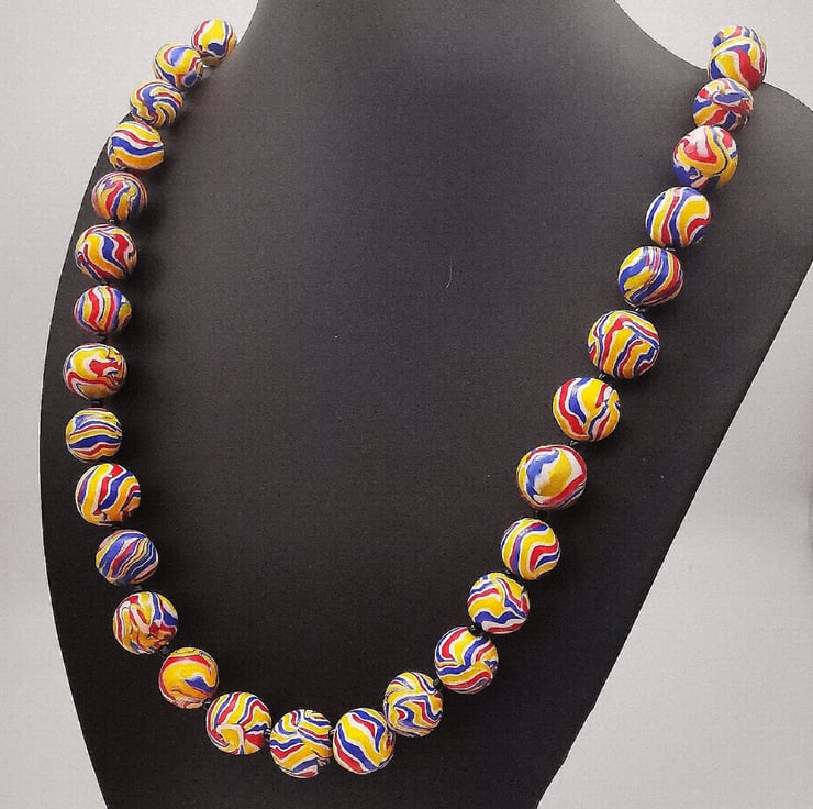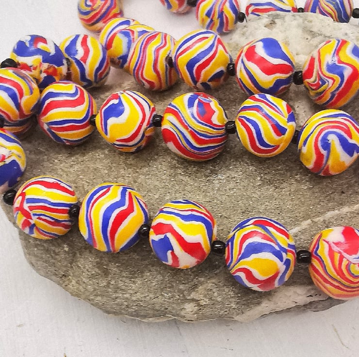 Vibrant handmade beads provide the eye-catching focus on this bold necklace. An eddy of peppy primary colours compose this carefree necklace. Each bead is handmade in polymer clay and interspaced with a reclaimed black seed bead.