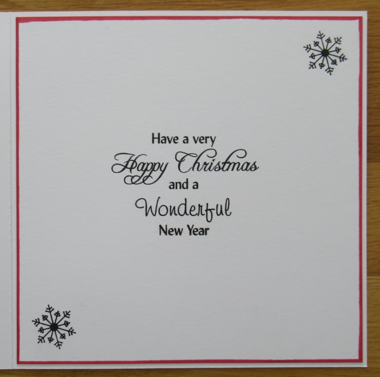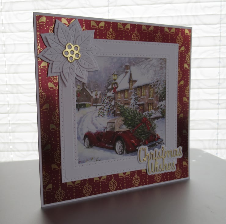 This lovely image of a car driving through a snowy village with a Christmas tree tied on the back, sits within a white frame which has a decorative pin dot edge. The background cardstock is a deep red mirror card with a delicate gold foil pattern to it. A lhome made, die cut poinsettia and a Christmas Wishes message finish the card, and the inside is finished to coordinate with a stamped Christmas verse as pictured.