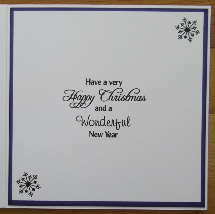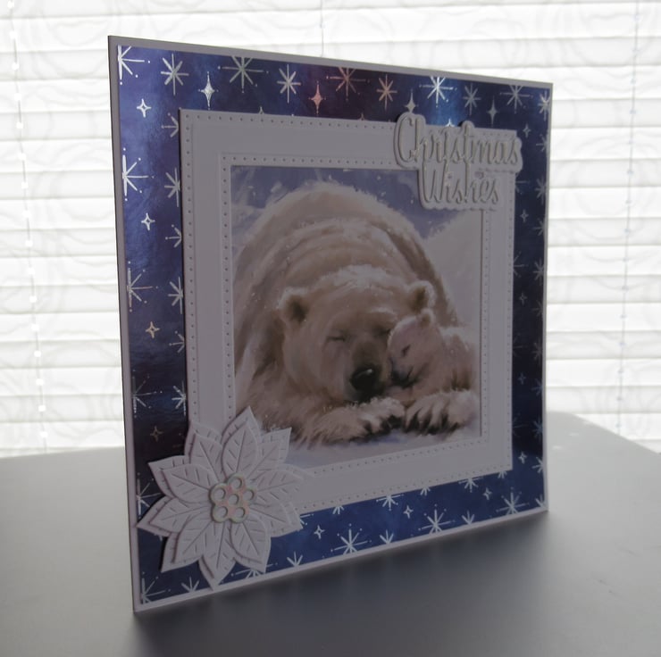 This lovely image of a mother polar bear snuggled up close with her cub, sits within a white frame which has a decorative pin dot edge. The background cardstock is a deep purple mirror card with a delicate silver foil pattern through it. A lovely home made, die cut poinsettia and a Christmas Wishes message finish the card, and the inside is finished to coordinate with a stamped Christmas verse as pictured.