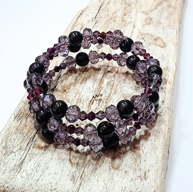This lovely bracelet is made from memory wire strung with purple crystal and black glass beads. The bracelet coils round your wrist, retains it's shape and really catch the light.