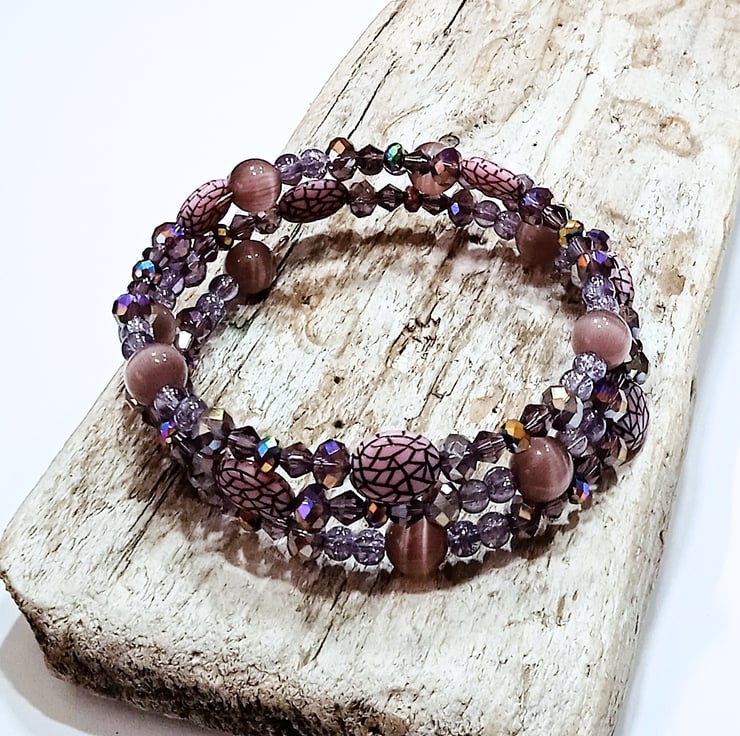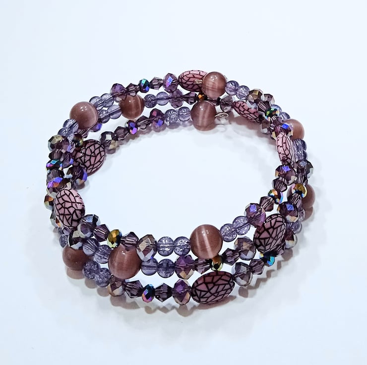 This lovely bracelet is made from memory wire strung with a variety of purple crystal, glass cats eye and decorative resin beads interspersed with small purple crackle glass beads. The bracelet coils round your wrist, retains it's shape and really catch the light.