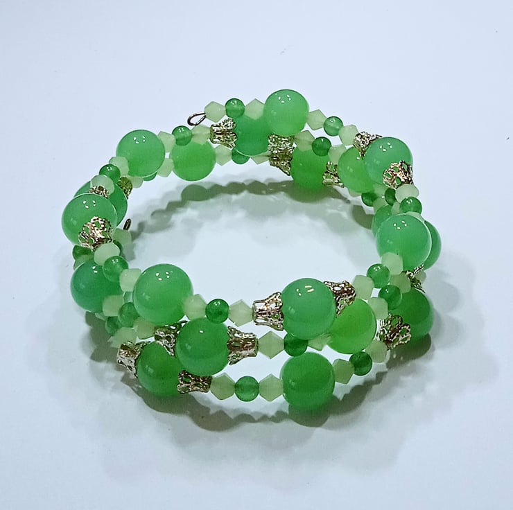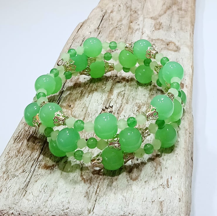 This lovely bracelet is made from memory wire strung with green glass beads interspersed with crystal beads and decorative silver plated spacers. The bracelet coils round your wrist, retains it's shape.