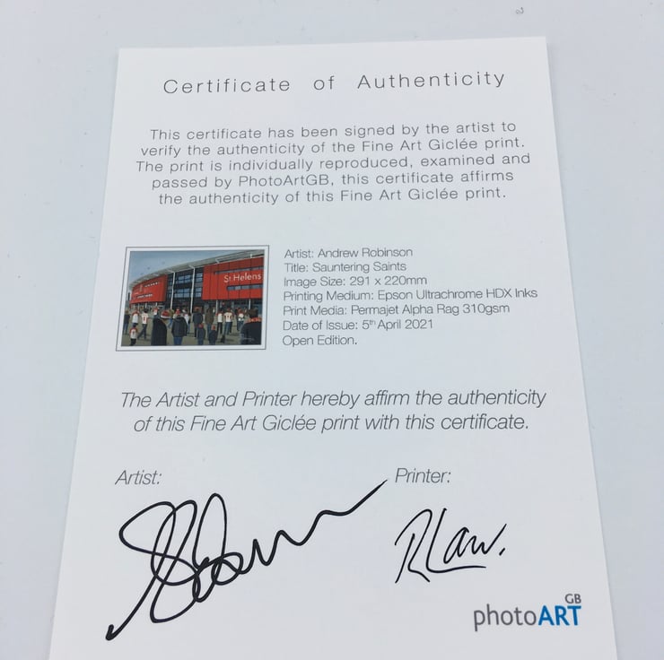 Titled ‘Sauntering Saints’ this is a unique St Helens RFC print direct from myself the artist. My artworks are a celebration of the match day experience and of stadium architecture.