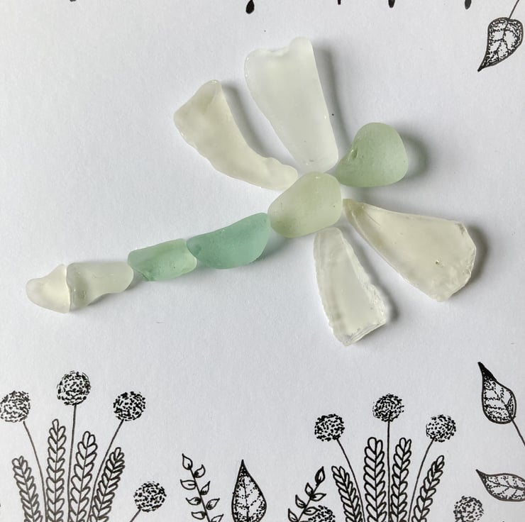Hand drawn by myself in ink with sea glass in shades of green and white from Cornish beaches.