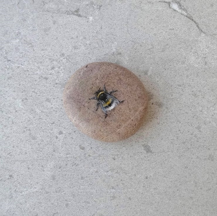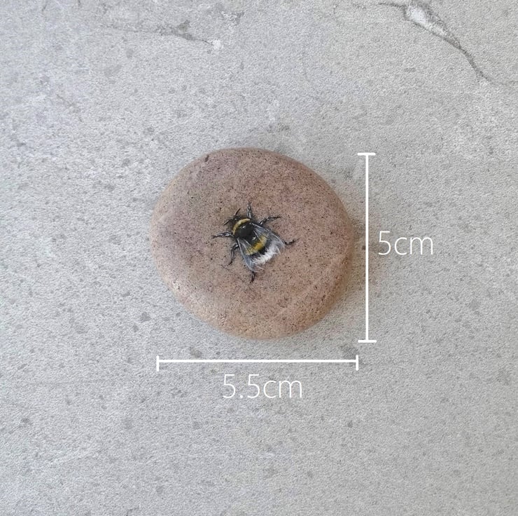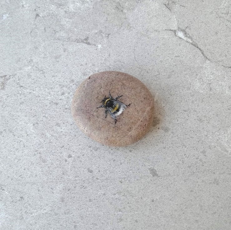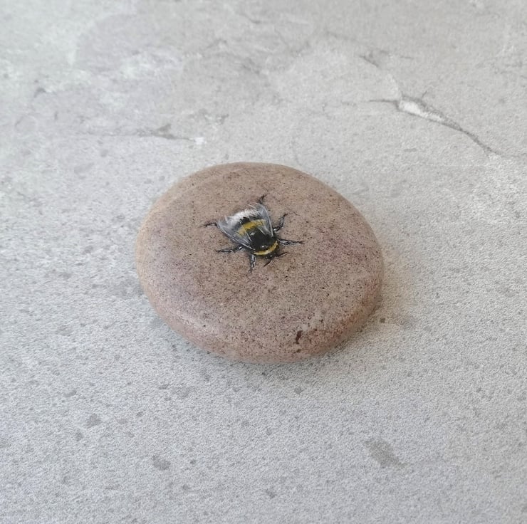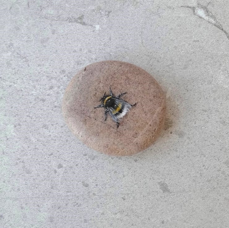 My latest bumble bee stone has been painted in quality acrylic paints and finished with three coats of acrylic sealer which gives them a smooth tactile finish.