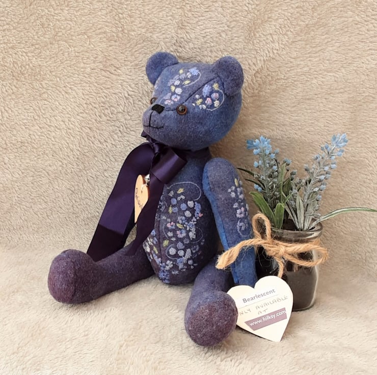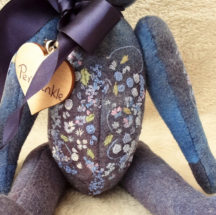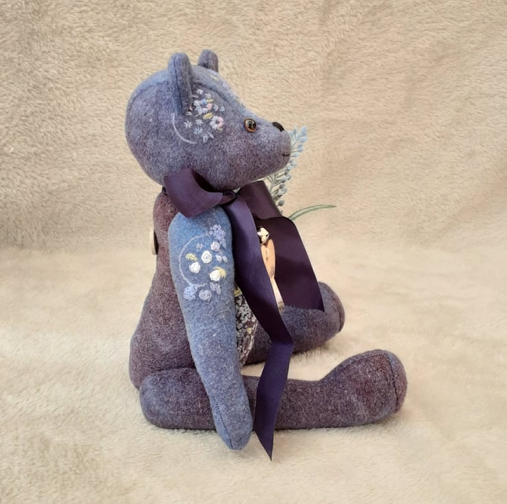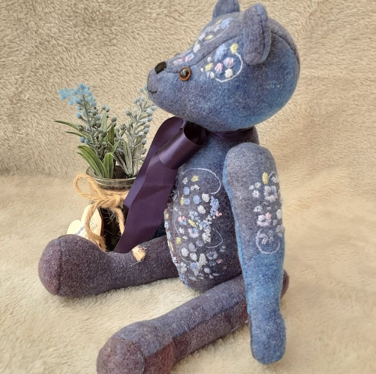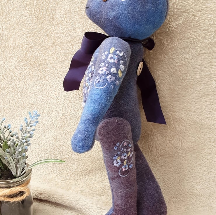 A unique hand embroidered Teddy bear hand crafted from hand dyed velvet wool fabric in deep blues, purples and a hint of plum.