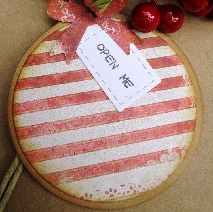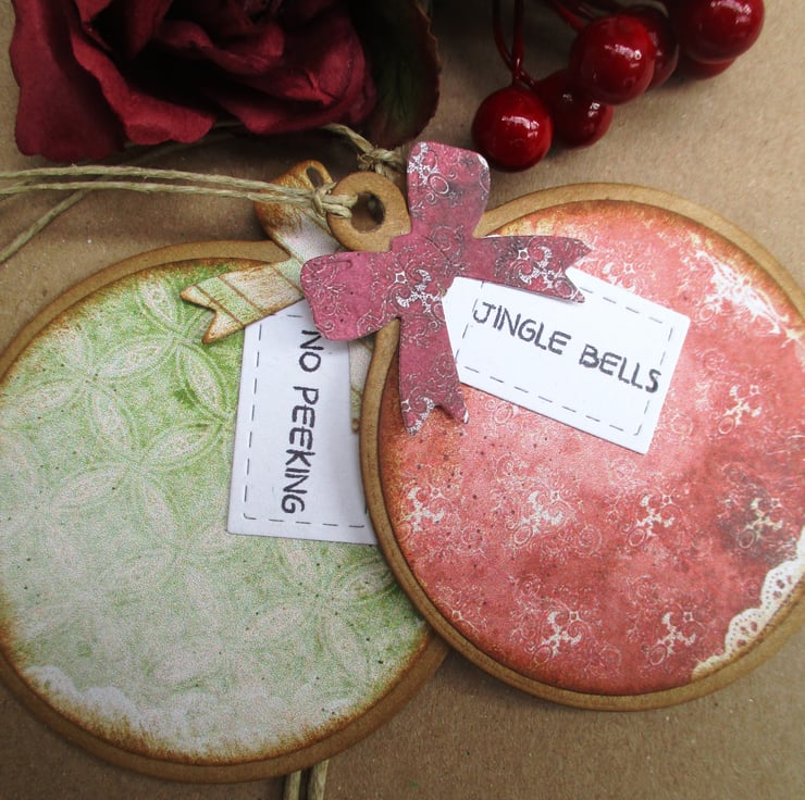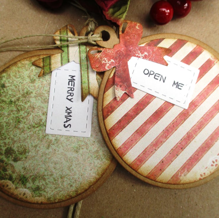 Christmas bauble gift tags, handmade with quality card, layered and ink aged around the edges and threaded with twine