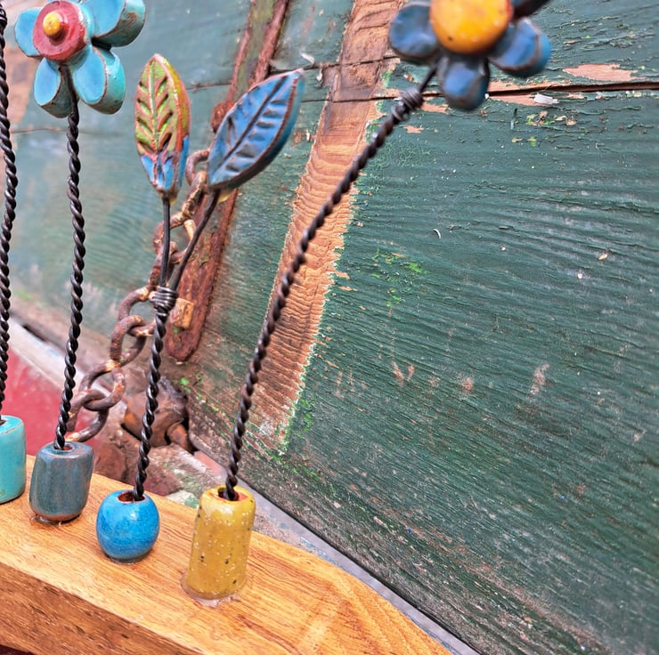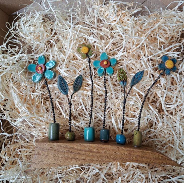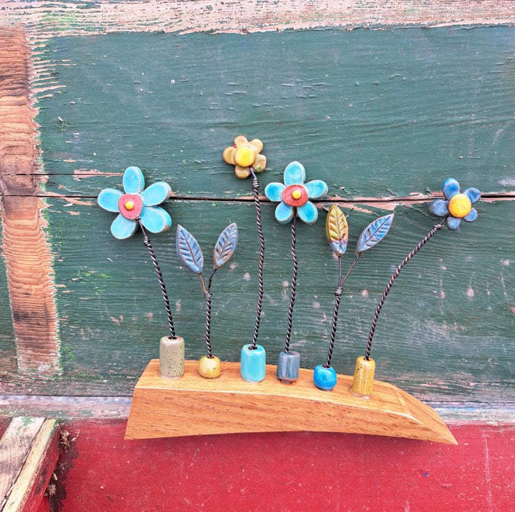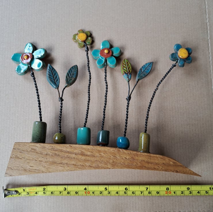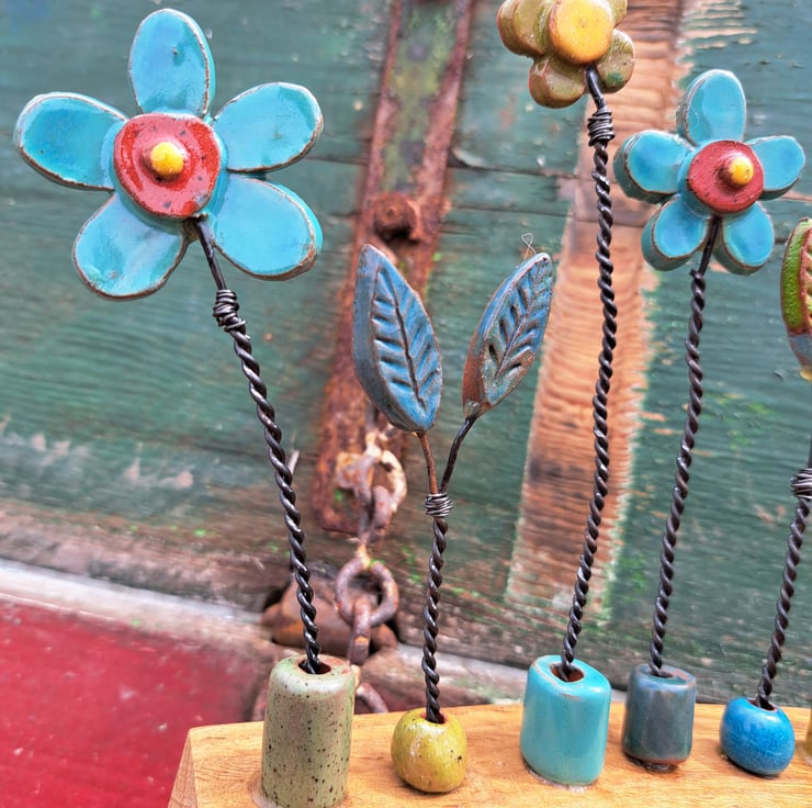 I make each pottery flower before attaching each one using discarded fence wire.