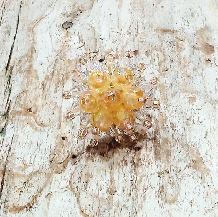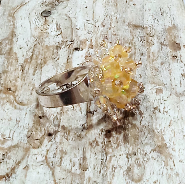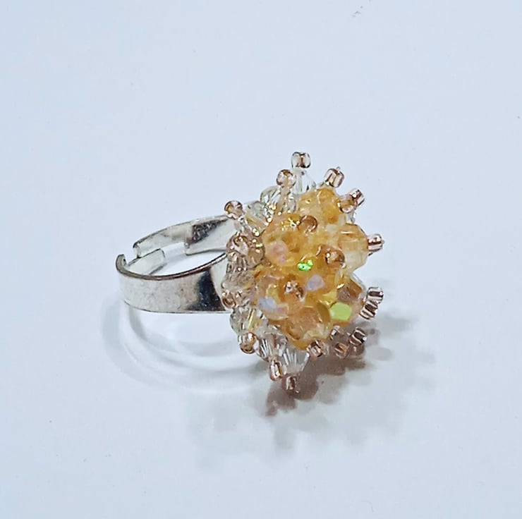 This ring is hand made from golden yellow and clear crystal beads which are individually strung onto a silver plated ring which is adjustable to fit most ring sizes.