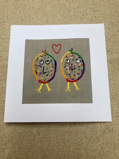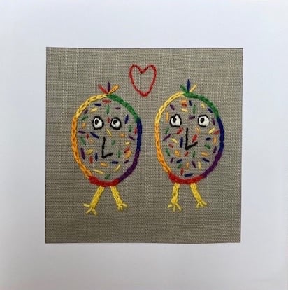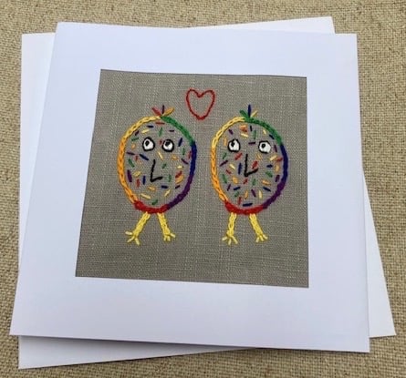 These two love bird Bogels ( the creatures who live in the back of your sock drawer and cupboards and move things around when you're not looking) have been hand embroidered onto a natural linen and mounted in a white aperture greeting card (144mm x 144mm). The card has been left blank inside for your own message.