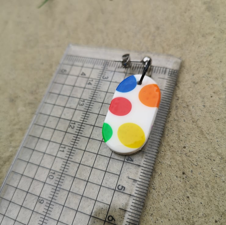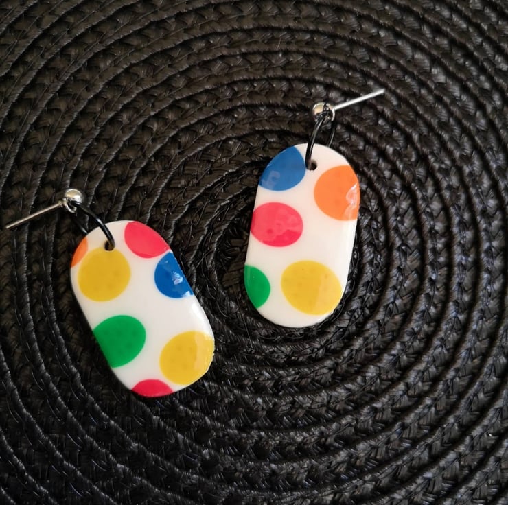 Ball stud pill shape earrings in colourful Polka dots design with UV resin coat for added shine, black aluminium jump ring