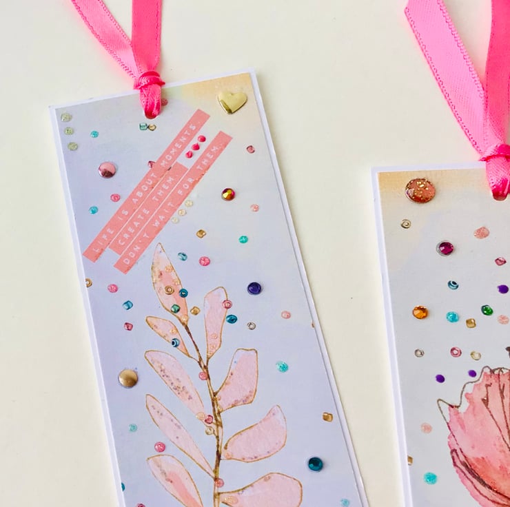 I put the collage design together myself which I then printed and Handfinished it with crystals and some glitter. I also used some pretty satin ribbon and a little trinket heart.