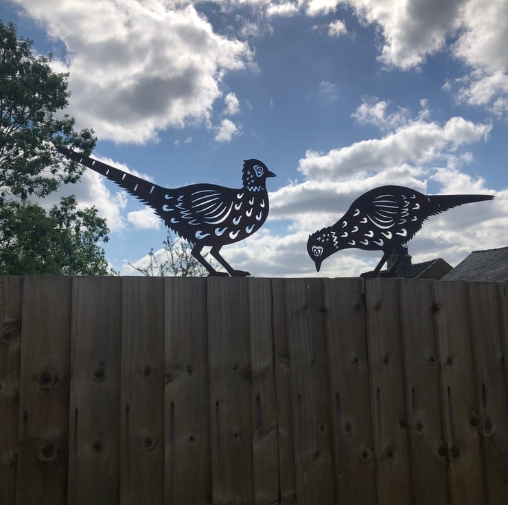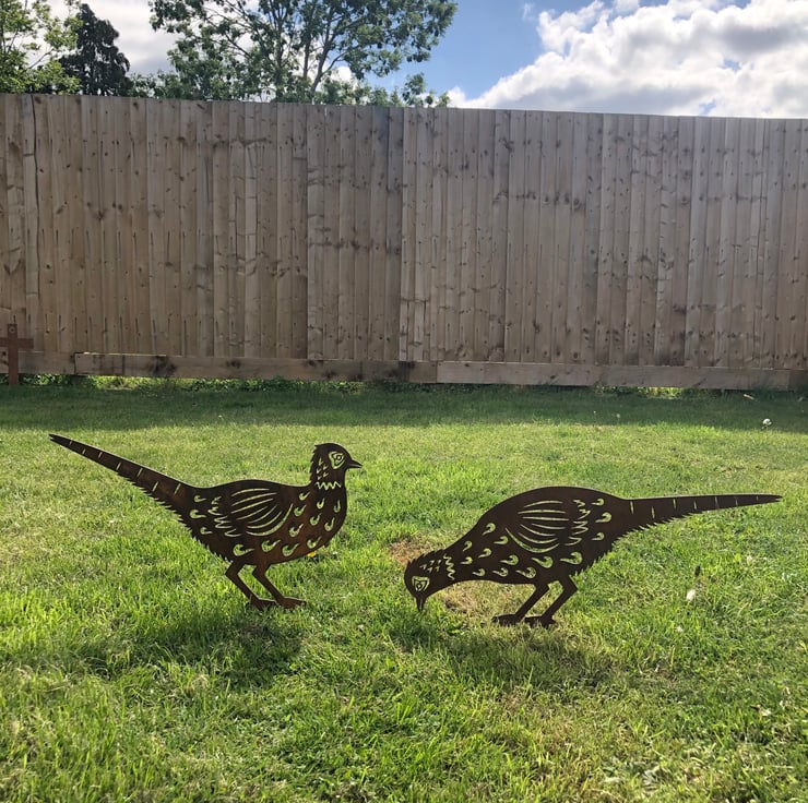 2 Rusty industrial style metal signs in the shape of a pair of pheasants. Can be used inside or outside. Spikes on their feet so you can pop them in the ground or on a fence or tree. GREAT FOR ANY HOME ,GARDEN,OFFICE,SHOP,PUB,CAFE,BAR,MAN CAVE, OR VINTAGE WEDDING, etc etc