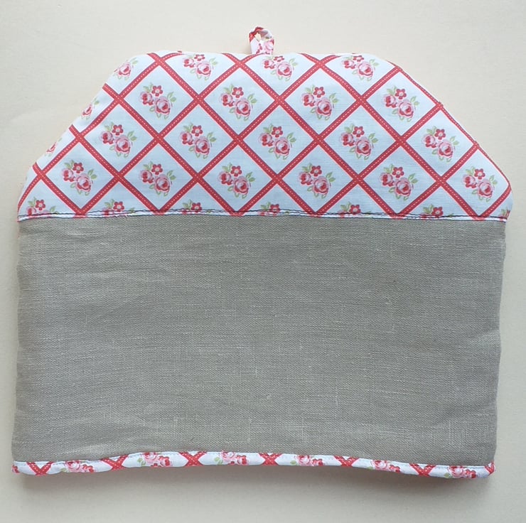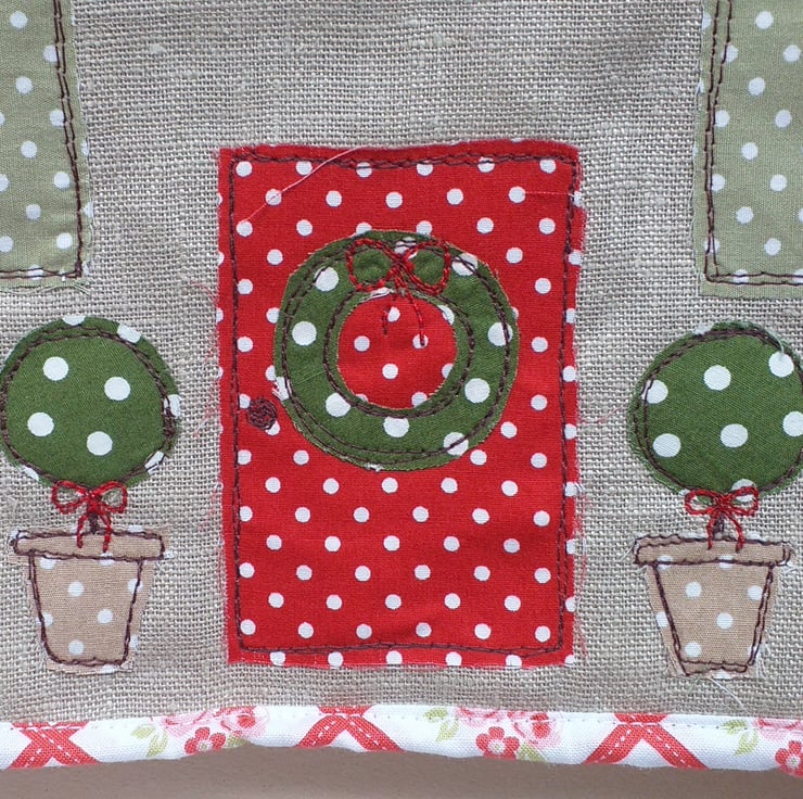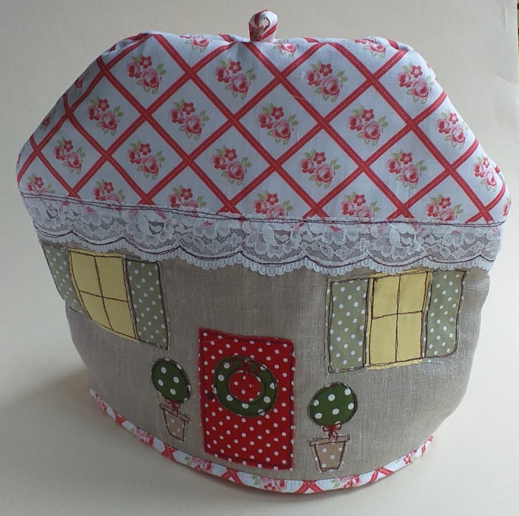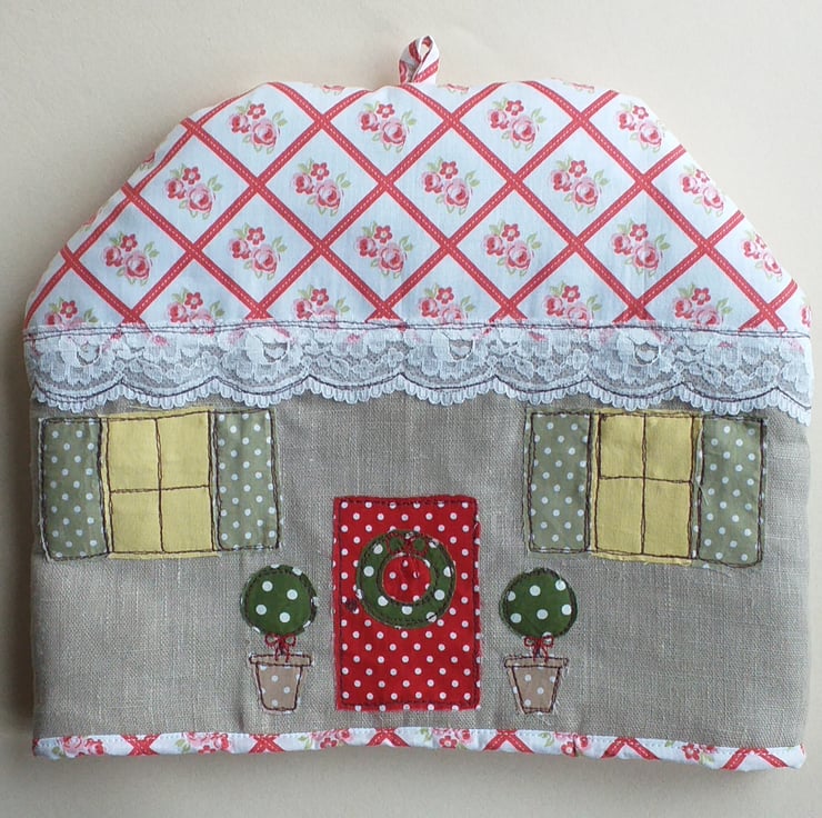 A quirky tea cosy to add a talking point to your tea table. Depicting a cottage frontage with two glowing windows and a bright red front door, this tea cosy will add a festive touch to your table. The wreath on the door and the bay trees either side give this cosy a christmassy feel, but not so overtly that it couldn't be used all year round. It is made from linen and a beautiful rose and check cotton. There is a lacy trim around the eaves.