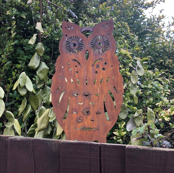 Rusty metal sign in the shape of a OWL.