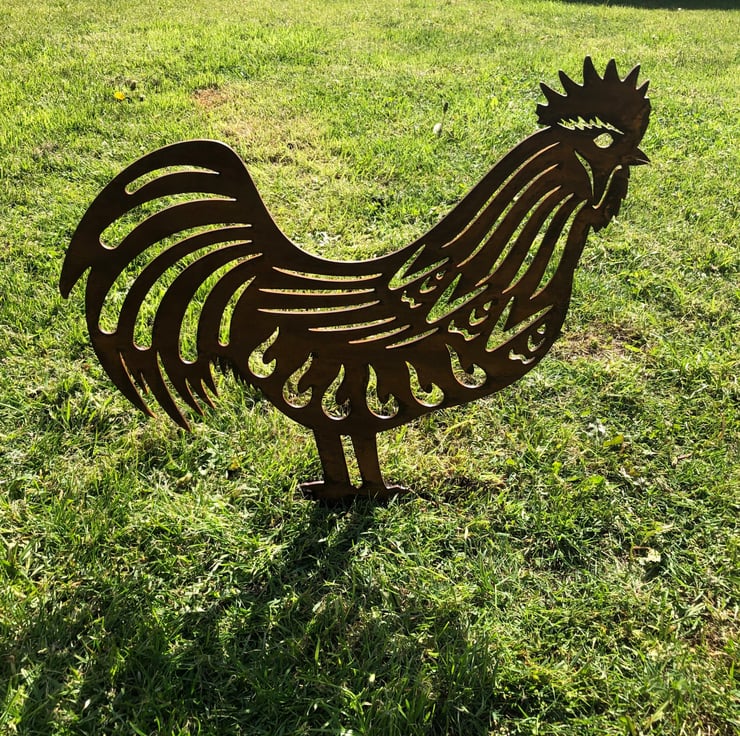 These large rusty metal Rooster silhouettes look great on the lawn or amongst the flowers .