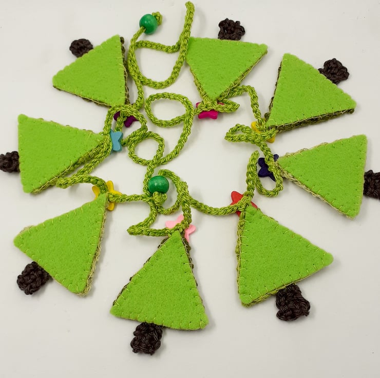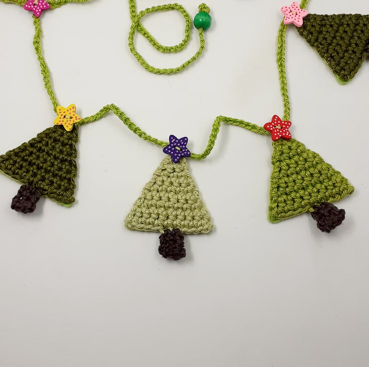This pretty garland is crocheted in cotton and each little tree is topped with a painted wooden star button. The trees are backed in stiffened felt and the ends of the 'string' are finished with painted wooden beads for easy tying. The whole garland measures approximately 110 cm and comes wrapped in tissue in a labelled PIP (Postage in Proportion) box all ready to be given or posted on. A tag with wording of your choice can be added to the box to make this a keepsake alternative to a greetings card.
