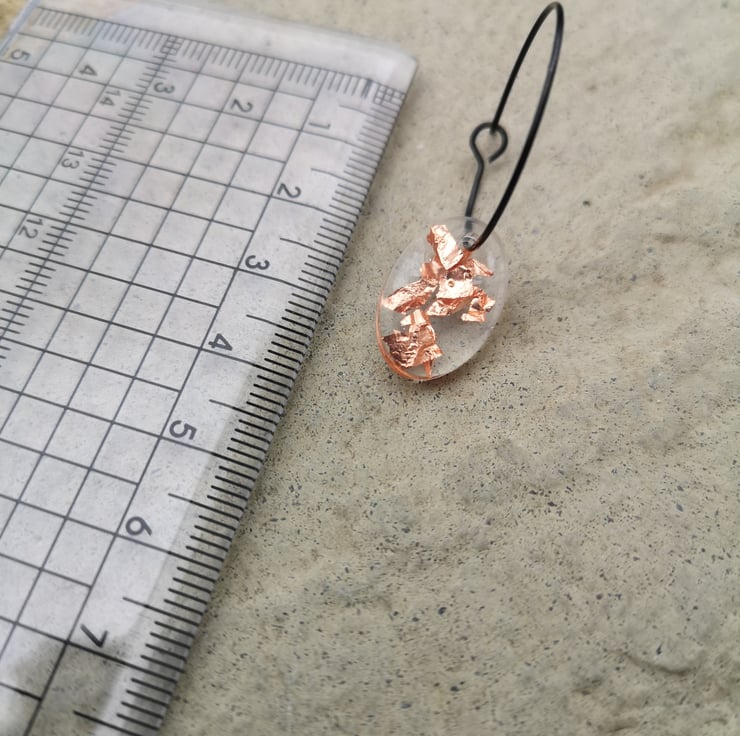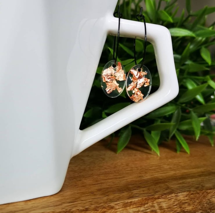Small oval resin earring encasing rose gold leaf on a 25mm stainless steel black hoop