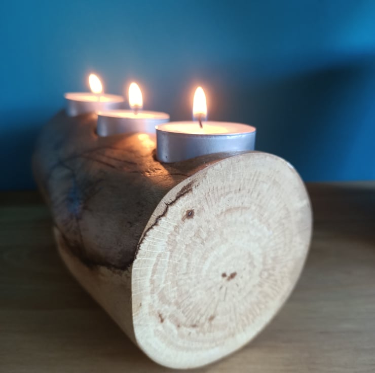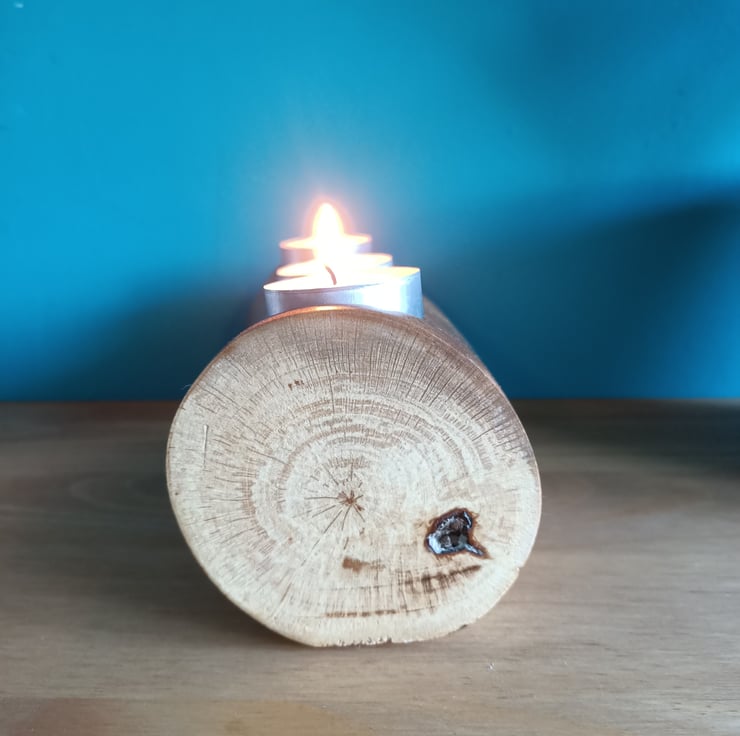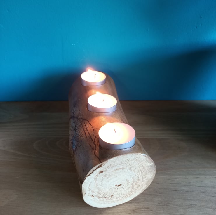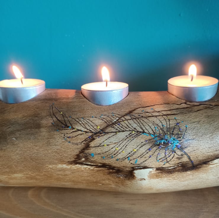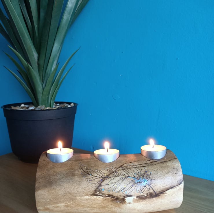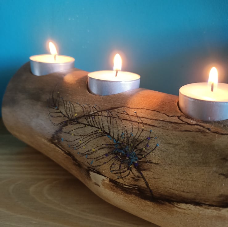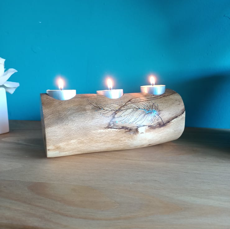 wooden oak log tealight holder candle holder with hand pyrographed feather. This beautiful reclaimed oak log has been made into a tealight holder suitable for three standard size tealights. We have removed the bark and sanded the log for a lovely rustic look. There is some beautiful natural spalting on this log and we added a hand painted and hand pyrographed feather to the front.