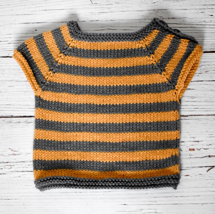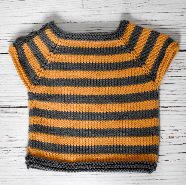0-3 months baby T-shirt/top hand knitted in Grey and Ochre acrylic blend yarn. Capped sleeves with three complimentary buttons on one shoulder for ease of fitting and removal. Perfect over a long sleeved vest for a cute layered look.
