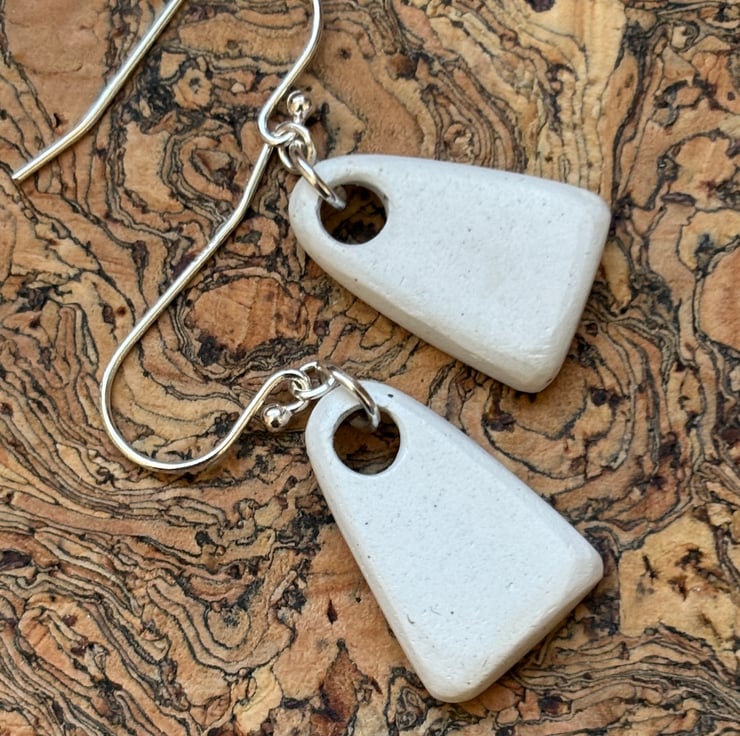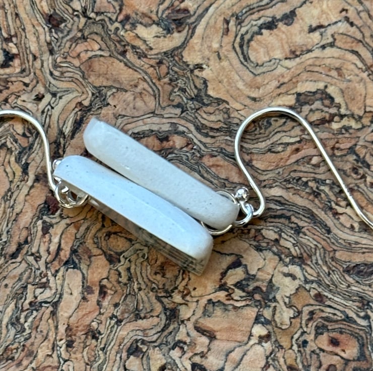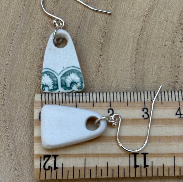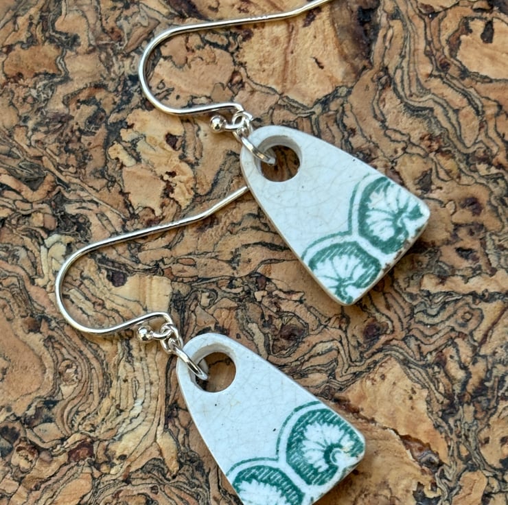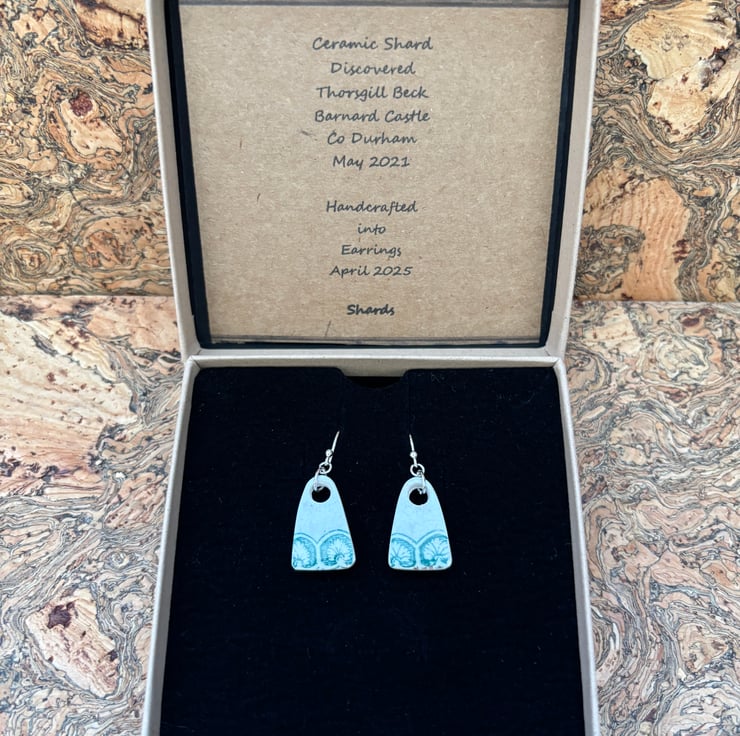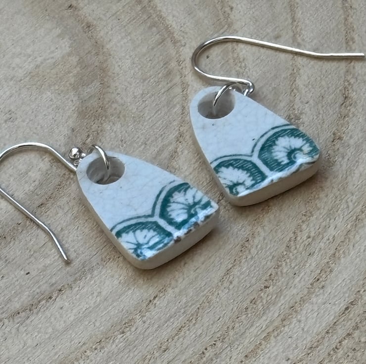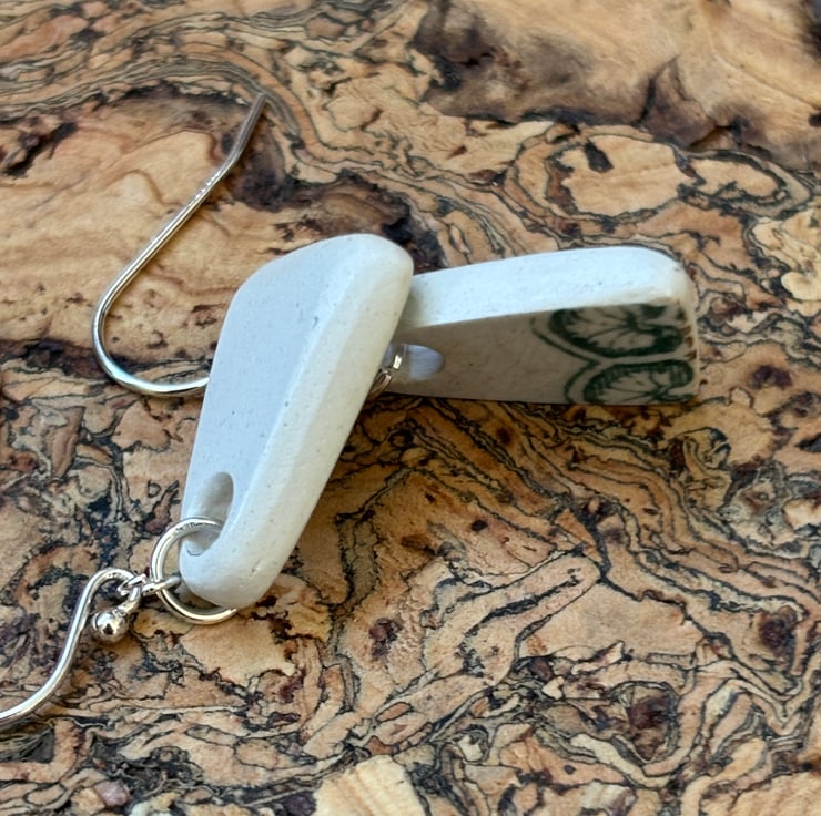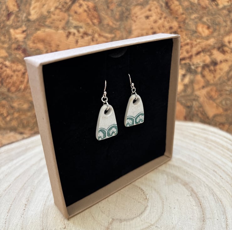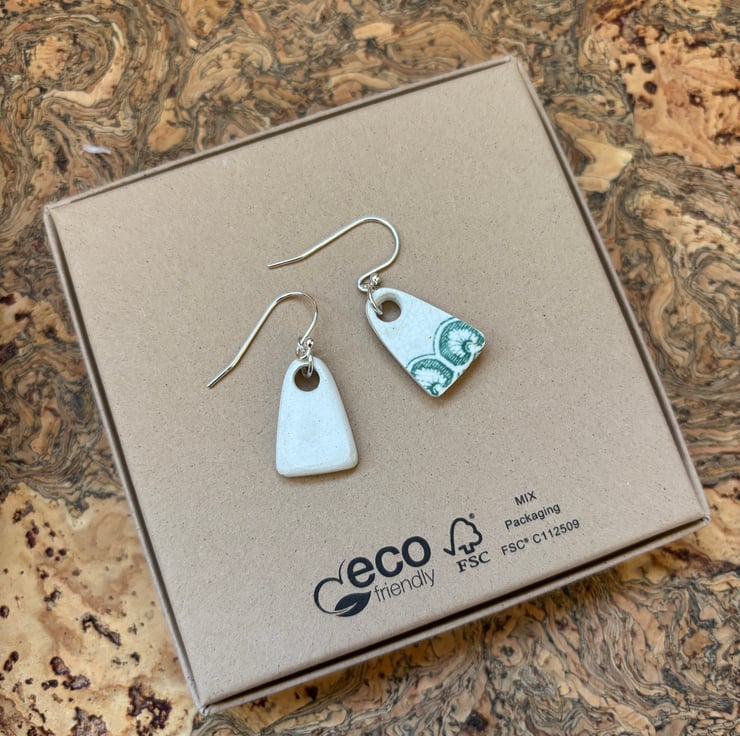 These earrings are made from a small piece of plate/saucer edge/rim found in the beck. I gently clipped to form two shards. I decided to sand the pieces into arch shapes to mimic the pattern on the edges, the front glaze is intact and shows slight crackling and marks. Backs and sides smoothed and sealed with Eco Friendly matt sealant.