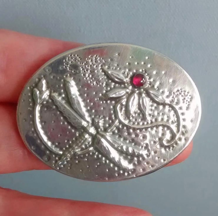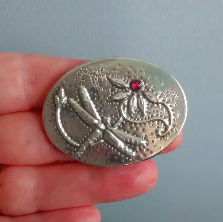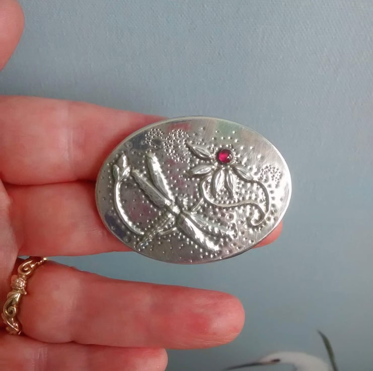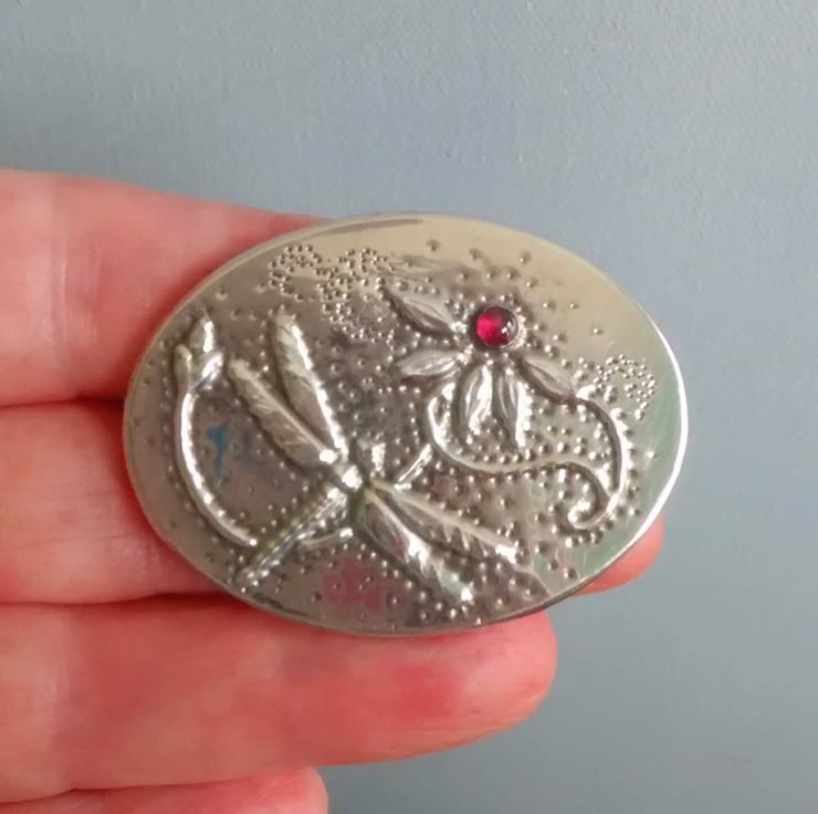 Silver pewter handmade Art Nouveau style dragonfly brooch with garnet stone.