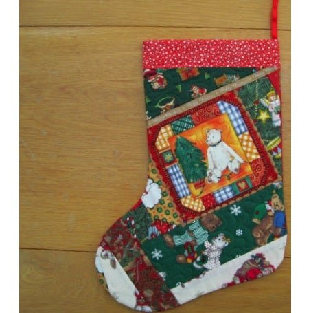 This Christmas stocking is made from crazy patchwork with a main panel (picture) of a teddy bear sitting by his Christmas tree. Other fabrics on the stocking feature teddy bears, Santa Claus etc. The back is a red and gold snowflake design. There is a hanging ribbon at the top.