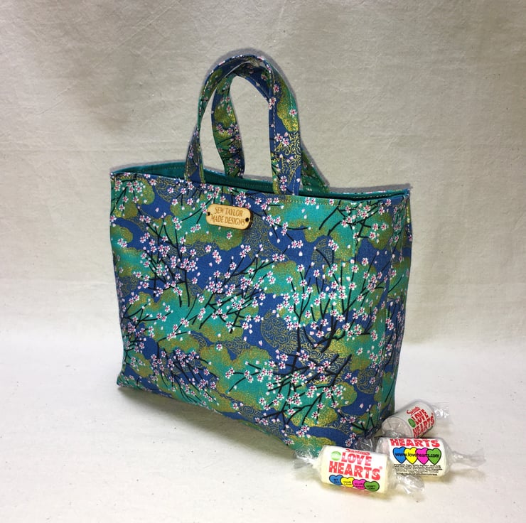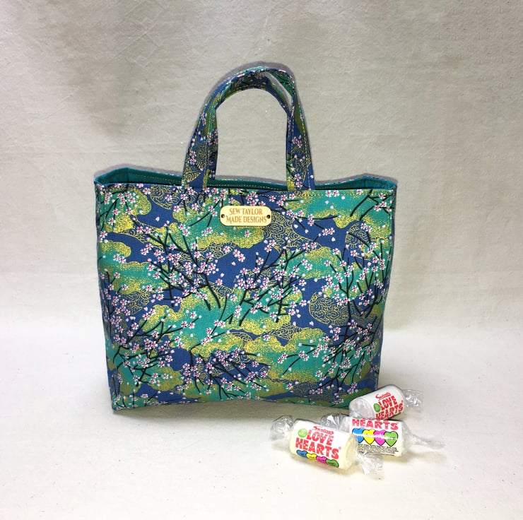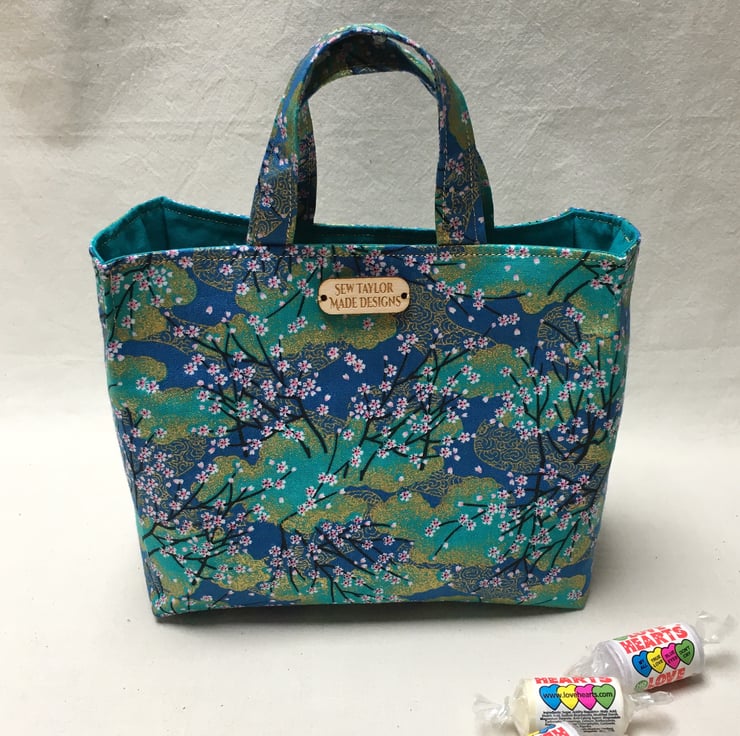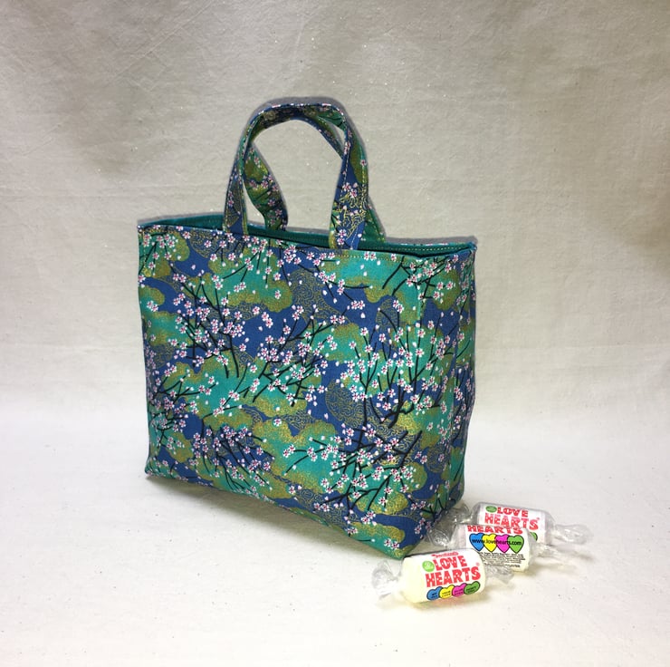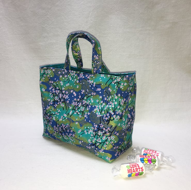A timeless Japanese turquoise, blue and gold gilded fabric patterned with tiny pink and white blossoms on thin black branches has been used to create this beautiful mini mini tote bag.