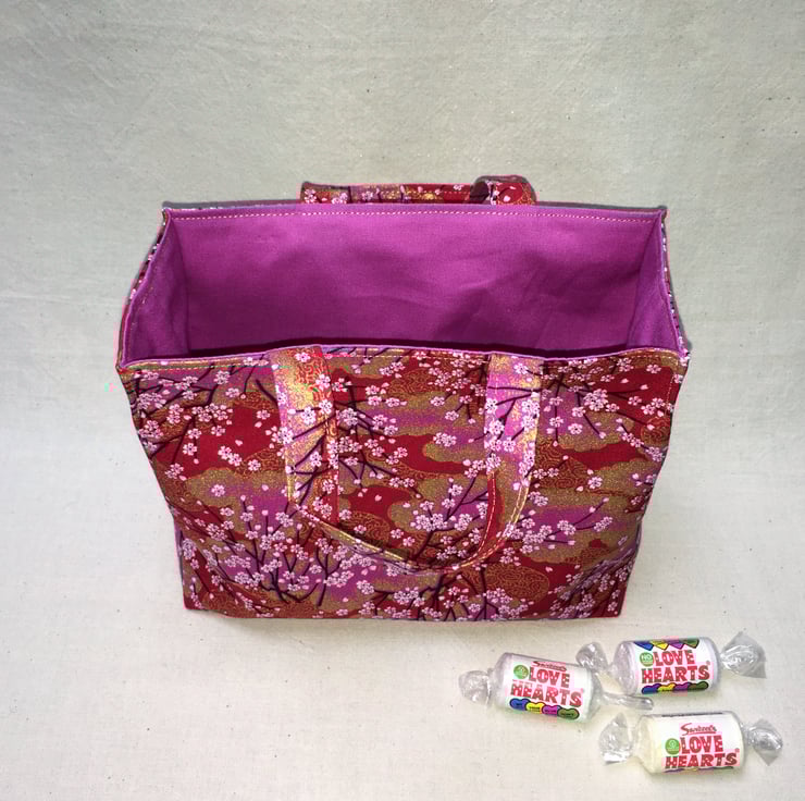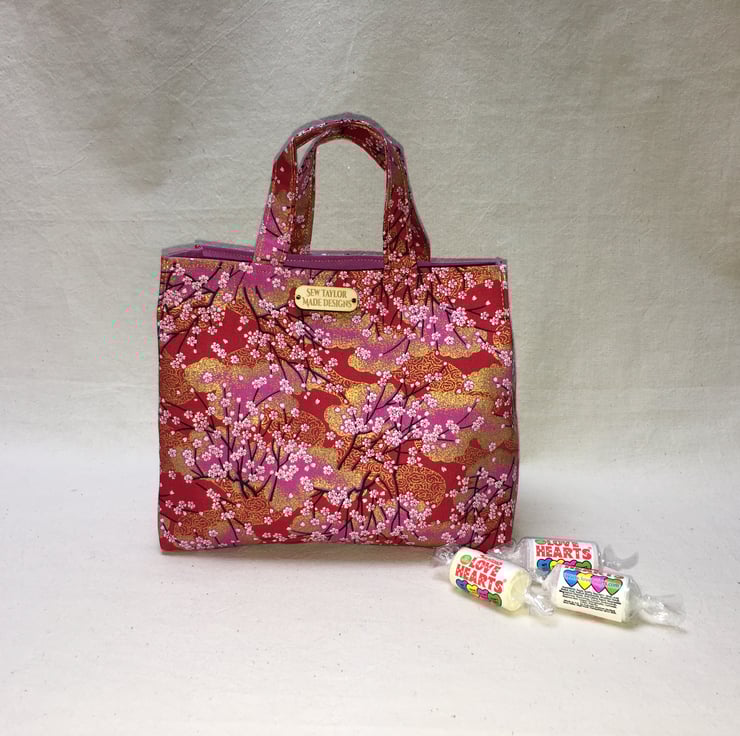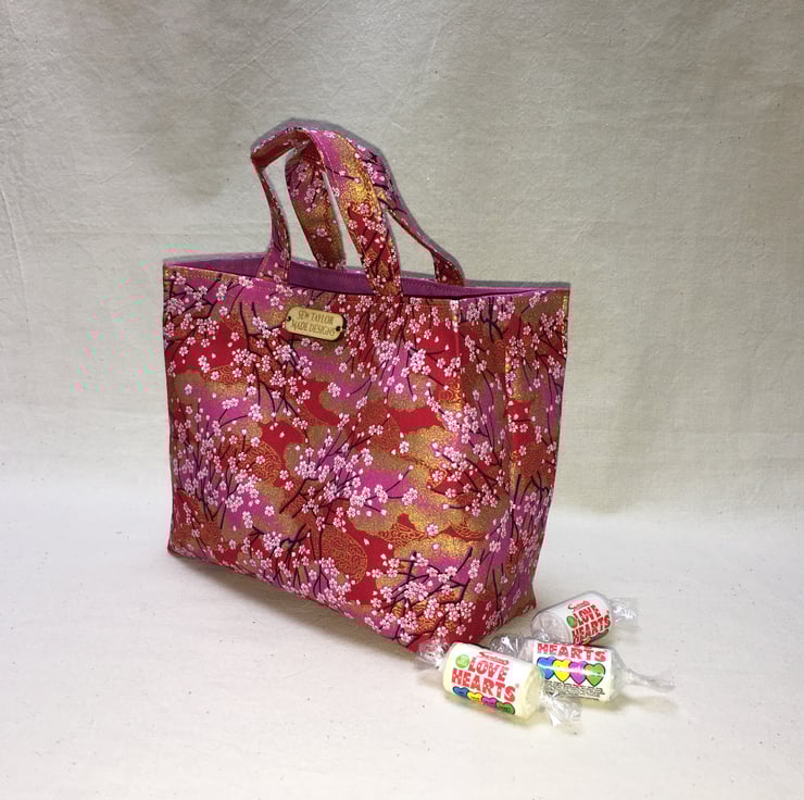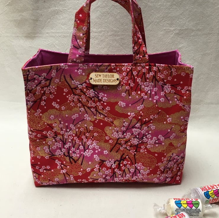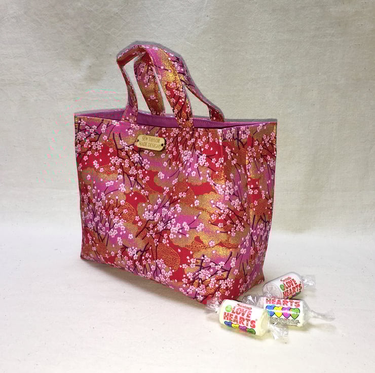A stunning cerise or pink, red and gold gilded fabric from Japan, patterned with tiny pink and white blossoms on thin black branches has been used to create this beautiful mini mini tote bag.