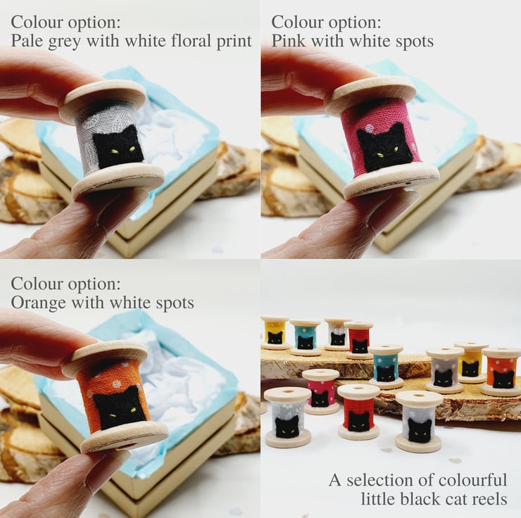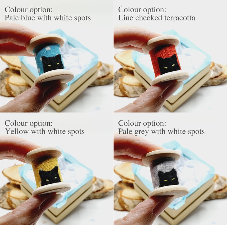 Just choose your favourite colour and bring some cheer to your space. The wooden reels have been individually wrapped by hand in a variety of fabrics and feature hand cut black felt cat heads with embroidered eyes. See how they peek up from the bottom!