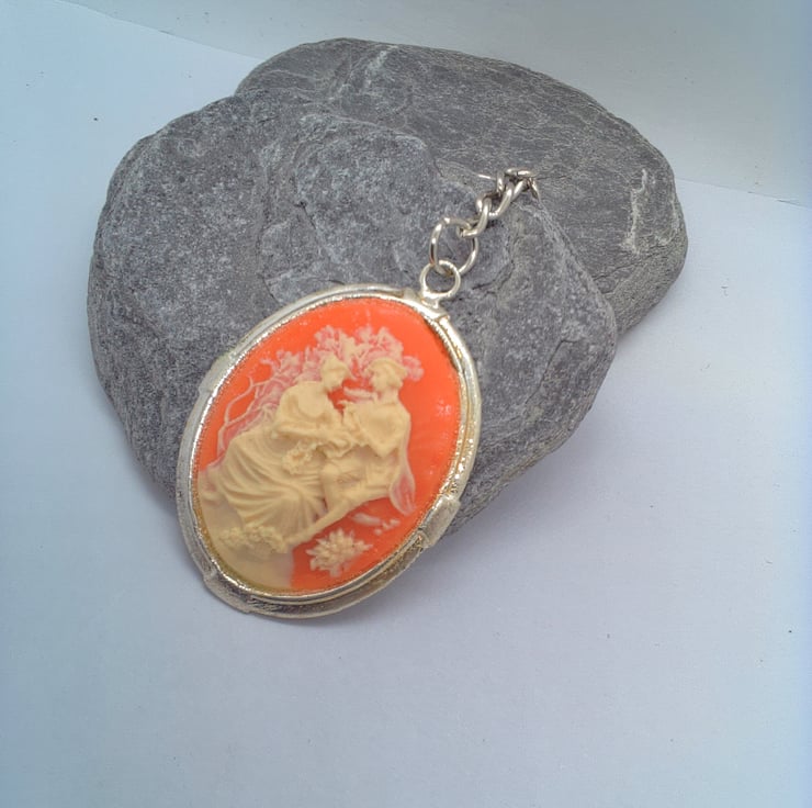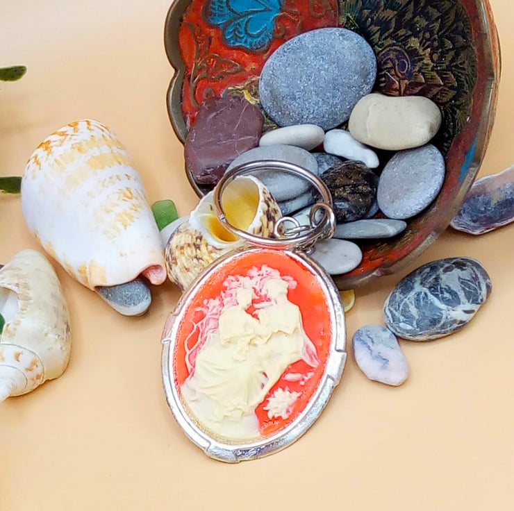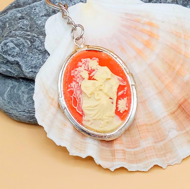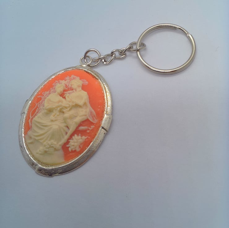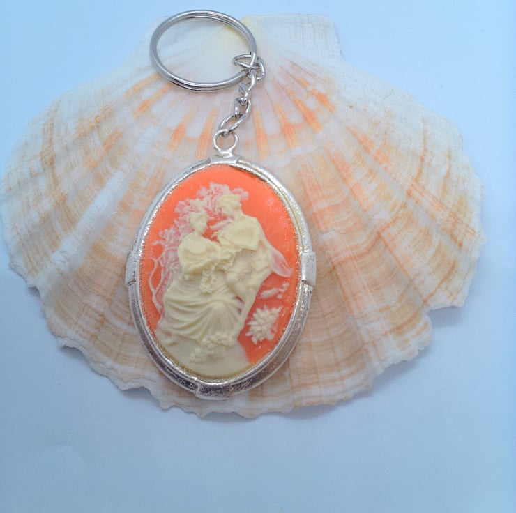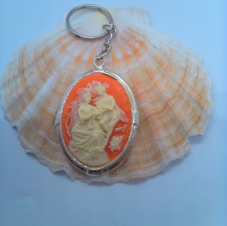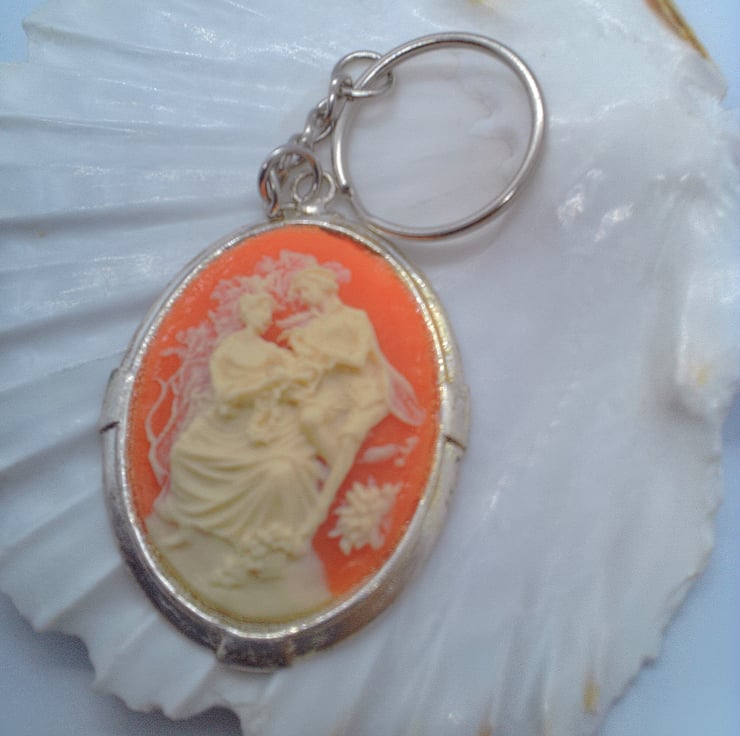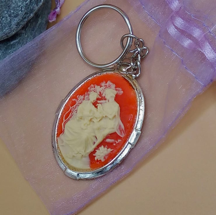 This fun and practical oval acrylic cameo key ring would make an ideal gift for a teacher, friend or relative to say "Thank You" or "I'm Thinking of You", or a treat for yourself. The key ring is silver plated and has a large oval acrylic pink and white cameo tag which measures 50 mm x 45 mm. The cameo is hung on a silver plated snake chain and ring for the keys. The key ring will be dispatched wrapped in tissue paper in an organza bag and delivered to you via Royal Mail first class post.