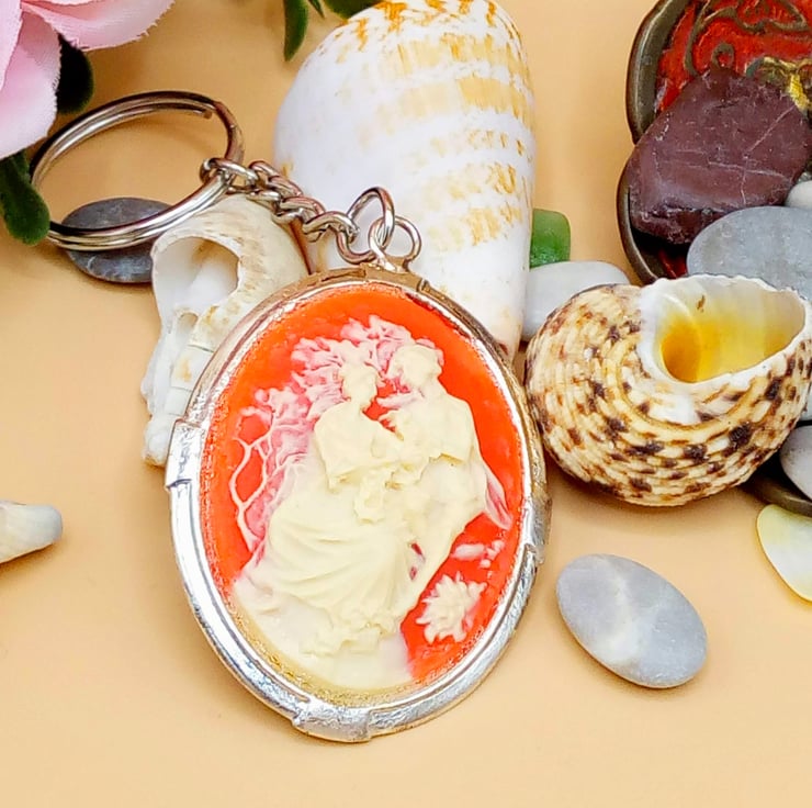 This fun and practical oval acrylic cameo key ring would make an ideal gift for a teacher, friend or relative to say "Thank You" or "I'm Thinking of You", or a treat for yourself. The key ring is silver plated and has a large oval acrylic pink and white cameo tag which measures 50 mm x 45 mm. The cameo is hung on a silver plated snake chain and ring for the keys. The key ring will be dispatched wrapped in tissue paper in an organza bag and delivered to you via Royal Mail first class post.
